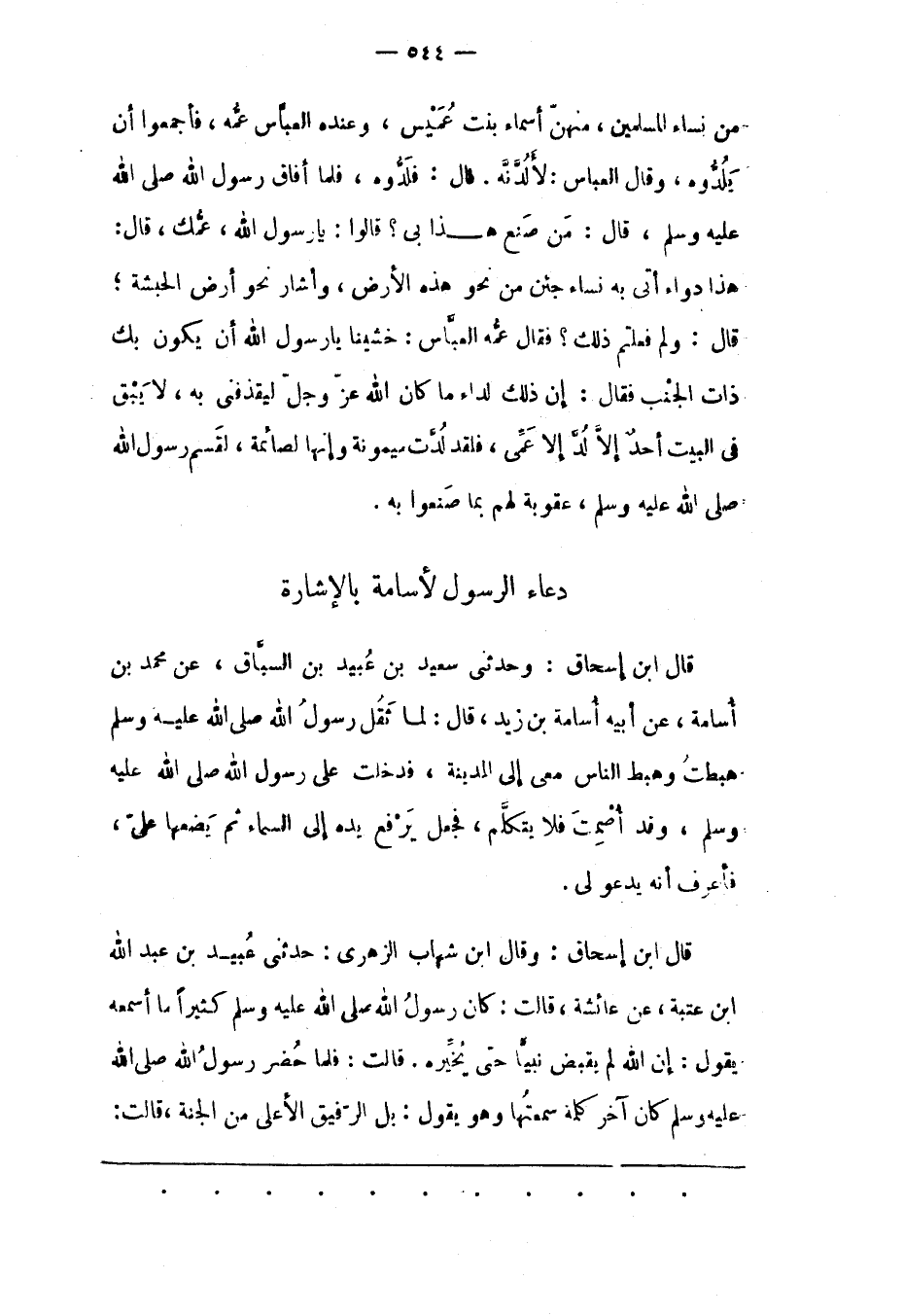 قَالَ ابْنُ إسْحَاقَ: وَحَدّثَنِي سَعِيدُ بْنُ عُبَيْدِ بْنِ السّبّاقِ، عَنْ مُحَمّدِ بْنِ أُسَامَةَ، عَنْ أَبِيهِ أُسَامَةَ بْنِ زيد، قَالَ: لَمّا ثَقُلَ رَسُولُ اللهِ صَلّى اللهُ عَلَيْهِ وَسَلّمَ هَبَطْتُ وَهَبَطَ النّاسُ مَعِي إلَى الْمَدِينَةِ، فَدَخَلْت عَلَى رَسُولِ اللهِ صَلَّى اللَّهُ عَلَيْهِ وَسَلَّمَ، وَقَدْ أُصْمِتَ فَلَا يَتَكَلّمُ، فَجَعَلَ يَرْفَعُ يَدَهُ إلَى السّمَاءِ ثُمّ يَضَعُهَا عَلَيّ، فَأَعْرِفُ أَنّهُ يَدْعُو لِي.