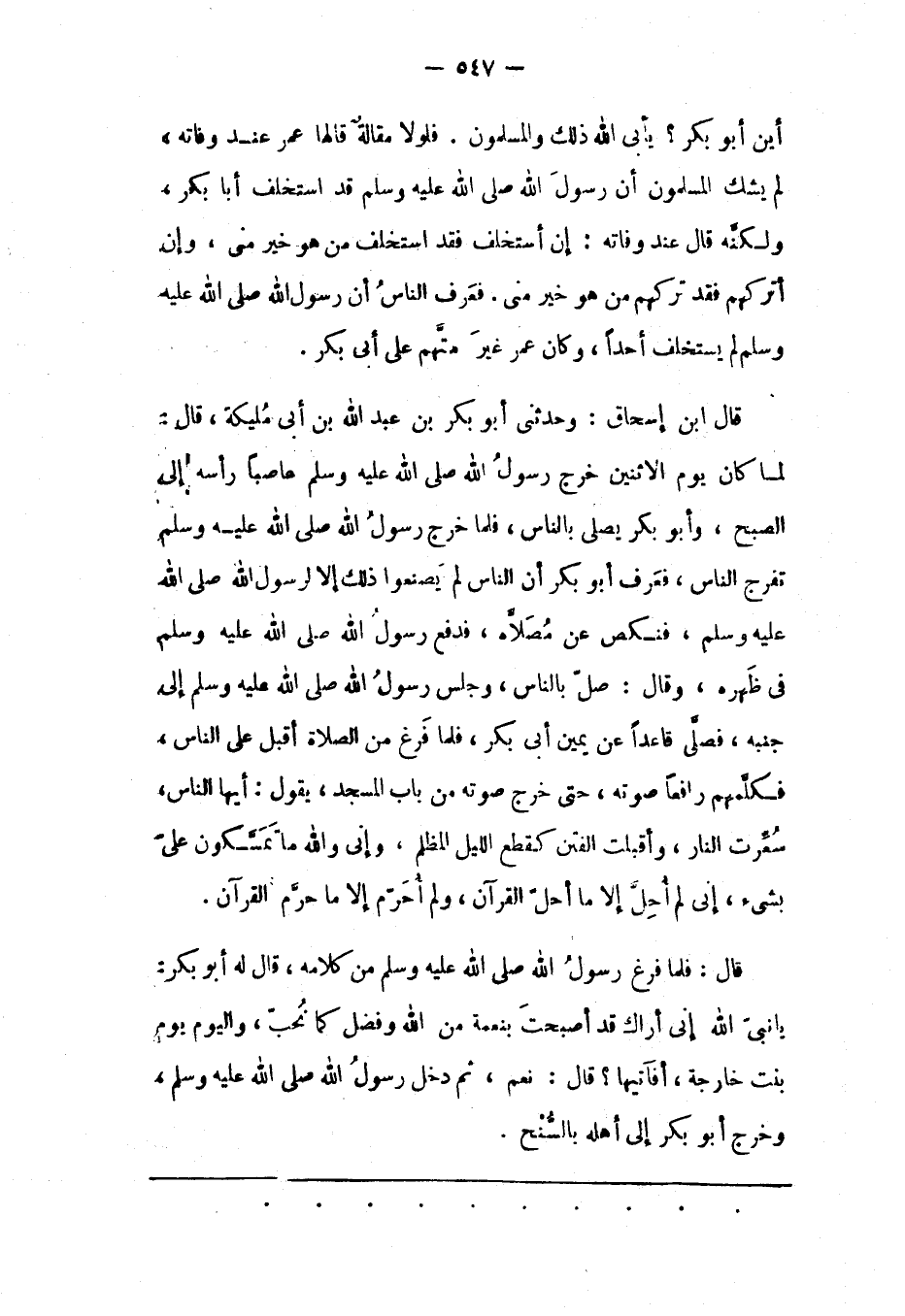 أين أبو بكر؟ يَأْبَى اللهُ ذَلِكَ وَالْمُسْلِمُونَ. فَلَوْلَا مَقَالَةٌ قَالَهَا عُمَرُ عِنْدَ وَفَاتِهِ، لَمْ يَشُكّ الْمُسْلِمُونَ أَنّ رسول الله صلى الله عليه وسلم قد اسْتَخْلَفَ أَبَا بَكْرٍ، وَلَكِنّهُ قَالَ عِنْدَ وَفَاتِهِ: إنْ أَسْتَخْلَفَ فَقَدْ اسْتَخْلَفَ مَنْ هُوَ خَيْرٌ مِنّي، وَإِنْ أَتَرَكَهُمْ فَقَدْ تَرَكَهُمْ مَنْ هُوَ خَيْرٌ مِنّي. فَعَرَفَ النّاسُ أَنّ رَسُولَ اللهِ صَلّى اللهُ عَلَيْهِ وَسَلّمَ لَمْ يَسْتَخْلِفْ أَحَدًا، وَكَانَ عُمَرُ غَيْرَ مَتّهُمْ عَلَى أَبِي بَكْرٍ.