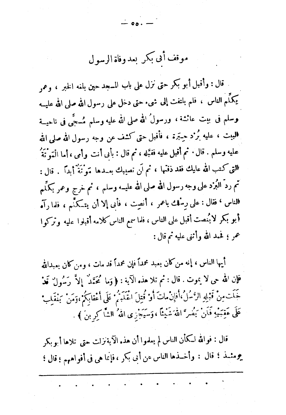أَيّهَا النّاسُ، إنّهُ مَنْ كَانَ يَعْبُدُ مُحَمّدًا فَإِنّ مُحَمّدًا قَدْ مَاتَ، وَمَنْ كَانَ يَعْبُدُ اللهَ فَإِنّ اللهَ حَيّ لَا يَمُوتُ. قَالَ: ثُمّ تَلَا هَذِهِ الْآيَةَ: وَما مُحَمَّدٌ إِلَّا رَسُولٌ قَدْ خَلَتْ مِنْ قَبْلِهِ الرُّسُلُ، أَفَإِنْ ماتَ أَوْ قُتِلَ انْقَلَبْتُمْ عَلى أَعْقابِكُمْ، وَمَنْ يَنْقَلِبْ عَلى عَقِبَيْهِ فَلَنْ يَضُرَّ اللَّهَ شَيْئاً، وَسَيَجْزِي اللَّهُ الشَّاكِرِينَ.