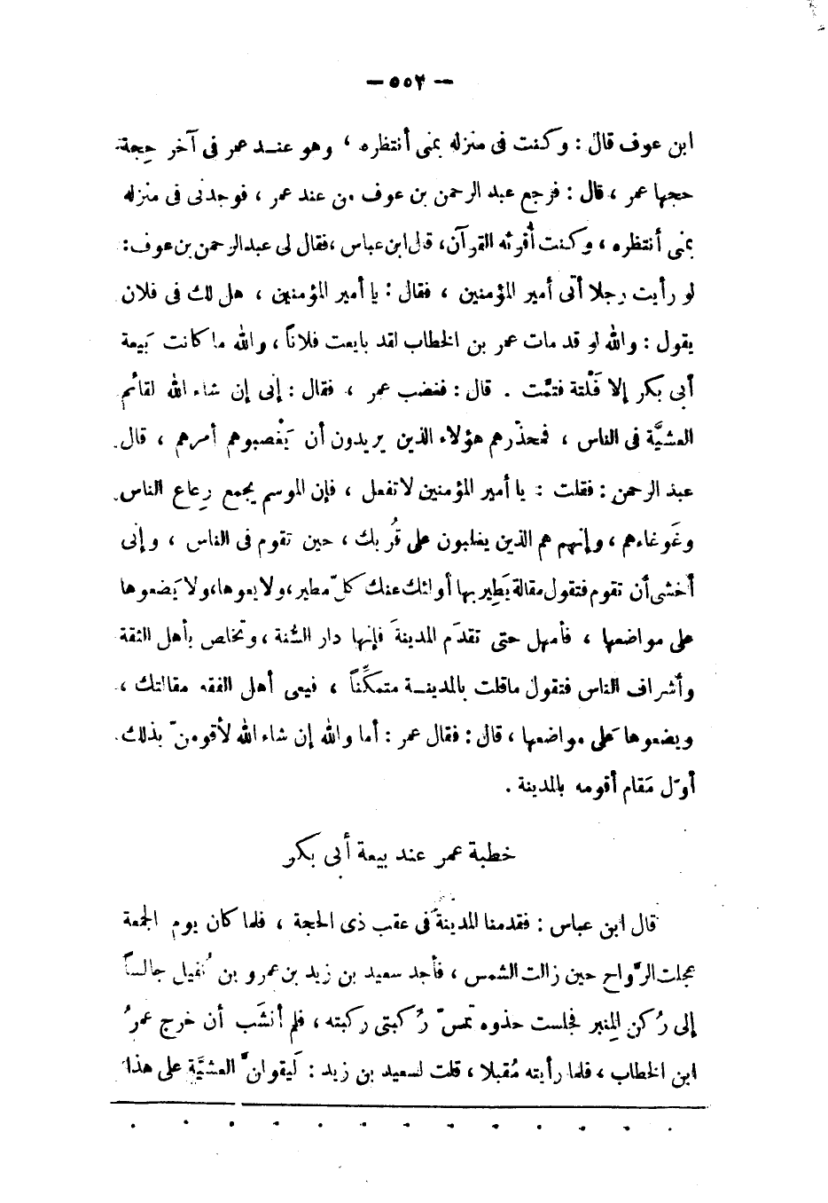 لَوْ رَأَيْت رَجُلًا أَتَى أَمِيرَ الْمُؤْمِنِينَ، فَقَالَ: يَا أَمِيرَ الْمُؤْمِنِينَ، هَلْ لَك فِي فُلَانٍ يَقُولُ: وَاَللهِ لَوْ قَدْ مَاتَ عُمَرُ بْنُ الْخَطّابِ لَقَدْ بَايَعْت فُلَانًا، وَاَللهِ مَا كَانَتْ بَيْعَةَ أَبِي بَكْرٍ إلّا فَلْتَةٌ فَتَمّتْ. قَالَ: فَغَضِبَ عُمَرُ، فَقَالَ: إنّي إنْ شَاءَ اللهُ لَقَائِمٌ الْعَشِيّةَ فِي النّاسِ، فَمُحَذّرُهُمْ هَؤُلَاءِ الّذِينَ يُرِيدُونَ أَنْ يَغْصِبُوهُمْ أَمْرَهُمْ، قَالَ عَبْدُ الرّحْمَنِ: فَقُلْت: يَا أَمِيرَ الْمُؤْمِنِينَ لَا تَفْعَلْ، فَإِنّ الْمَوْسِمَ يَجْمَعُ رِعَاعَ النّاسِ وَغَوْغَاءَهُمْ، وَإِنّهُمْ هُمْ الّذِينَ يَغْلِبُونَ عَلَى قُرْبِك، حِينَ تَقُومُ فِي النّاسِ، وَإِنّي أَخْشَى أَنْ تَقُومَ فَتَقُولُ مَقَالَةً يَطِيرُ بِهَا أُولَئِكَ عَنْك كُلّ مَطِيرٍ، وَلَا يَعُوهَا، وَلَا يَضَعُوهَا عَلَى مَوَاضِعِهَا، فَأَمْهِلْ حَتّى تَقْدَمَ الْمَدِينَةَ فَإِنّهَا دَارُ السّنّةِ، وَتَخْلُصُ بِأَهْلِ الثّقَةِ وَأَشْرَافِ النّاسِ فَتَقُولُ مَا قُلْت بِالْمَدِينَةِ مُتَمَكّنًا، فَيَعِيَ أَهْلُ الْفِقْهِ مَقَالَتَك، وَيَضَعُوهَا عَلَى مَوَاضِعِهَا، قَالَ: فَقَالَ عُمَرُ: أَمَا وَاَللهِ إنّ شَاءَ اللهُ لَأَقُومَنّ بِذَلِكَ أَوّلَ مَقَامٍ أَقُومُهُ بِالْمَدِينَةِ.