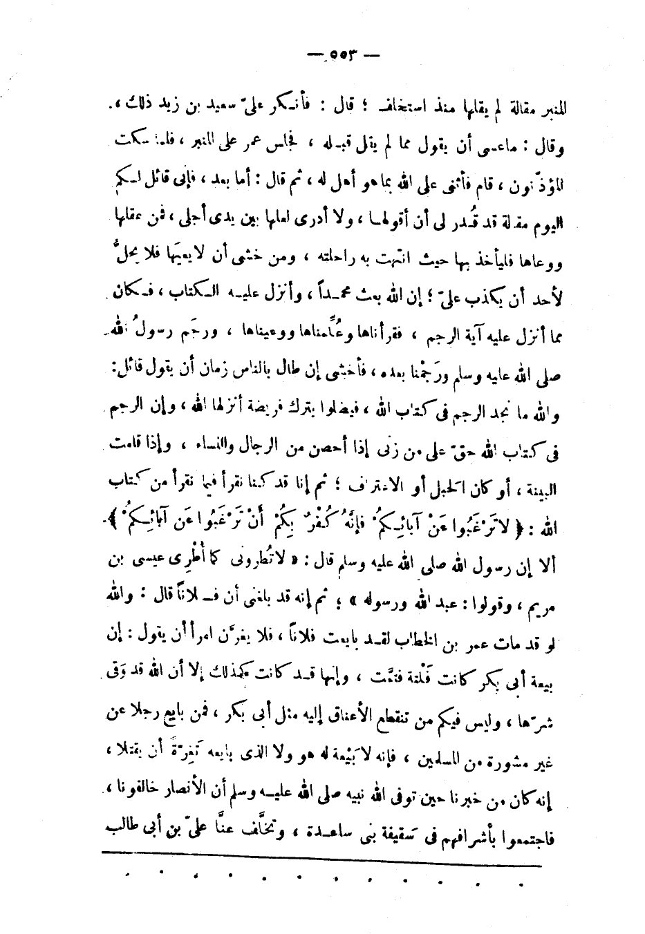 وَاَللهِ مَا نَجِدُ الرّجْمَ فِي كِتَابِ اللهِ، فَيَضِلّوا بِتَرْكِ فَرِيضَةٍ أَنَزَلَهَا اللهُ، وَإِنّ الرّجْمَ فِي كِتَابِ اللهِ حَقّ عَلَى مَنْ زَنَى إذَا أُحْصِنَ مِنْ الرّجَالِ وَالنّسَاءِ، وَإِذَا قَامَتْ البينة، أو كان الحبل أو الاعترف؛ ثُمّ إنّا قَدْ كُنّا نَقْرَأُ فِيمَا نَقْرَأُ مِنْ كِتَابِ اللهِ: لَا تَرْغَبُوا عَنْ آبَائِكُمْ فَإِنّهُ كُفْرٌ بِكُمْ أَنْ تَرْغَبُوا عَنْ آبَائِكُمْ إلا أن رسول الله صلى الله عليه وَسَلّمَ قَالَ: «لَا تُطْرُونِي كَمَا أُطْرِيَ عِيسَى بن مَرْيَمَ، وَقُولُوا: عَبْدُ اللهِ وَرَسُولُهُ» ؛ ثُمّ إنّهُ قَدْ بَلَغَنِي أَنّ فُلَانًا قَالَ: وَاَللهِ لَوْ قَدْ مَاتَ عُمَرُ بْنُ الْخَطّابِ لَقَدْ بَايَعْت فُلَانًا، فَلَا يَغُرّنّ امْرَأً أَنْ يَقُولُ: إنّ بيعة أبى بكر كَانَتْ فَلْتَةً فَتَمّتْ، وَإِنّهَا قَدْ كَانَتْ كَذَلِكَ إلّا أَنّ اللهَ قَدْ وَقَى شَرّهَا، وَلَيْسَ فِيكُمْ مَنْ تَنْقَطِعُ الْأَعْنَاقُ إلَيْهِ مِثْلَ أَبِي بكر، فَمَنْ بَايَعَ رَجُلًا عَنْ غَيْرِ مَشُورَةٍ مِنْ الْمُسْلِمِينَ، فَإِنّهُ لَا بَيْعَةَ لَهُ هُوَ وَلَا الّذِي بَايَعَهُ تَغِرّةً أَنْ يَقْتُلَا، إنّهُ كَانَ مِنْ خَبَرِنَا حِينَ تَوَفّى اللهُ نَبِيّهُ صَلّى اللهُ عَلَيْهِ وَسَلّمَ أَنّ الْأَنْصَارَ خَالَفُونَا، فَاجْتَمَعُوا بِأَشْرَافِهِمْ فِي سَقِيفَةِ بَنِي سَاعِدَةَ، وَتَخَلّفَ عَنّا علي بن أبي طالب