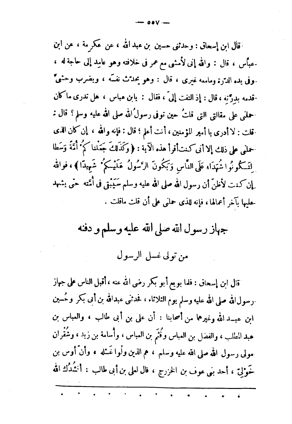 قَالَ ابْنُ إسْحَاقَ: فَلَمّا بُويِعَ أَبُو بَكْر رَضِيَ اللهُ عَنْهُ، أَقْبَلَ النّاسُ عَلَى جَهَازِ رسول الله صلى الله عليه وسلم يوم الثّلَاثَاءِ، فَحَدّثَنِي عَبْدُ اللهِ بْنُ أَبِي بَكْرٍ وحسين ابن عَبْدِ اللهِ وَغَيْرُهُمَا مِنْ أَصْحَابِنَا: أَنّ عَلِيّ بن أبي طالب، والعباس بن عبد المطلب، وَالْفَضْلَ بْنَ الْعَبّاسِ وَقُثَمَ بْنَ الْعَبّاسِ، وَأُسَامَةَ بْنَ زَيْدٍ، وَشُقْرَانَ مَوْلَى رَسُولِ اللهِ صَلَّى اللَّهُ عَلَيْهِ وَسَلَّمَ، هُمْ الّذِينَ وُلُوا غَسْلَهُ، وَأَنّ أَوْسَ بْنَ خَوْلِيّ، أَحَدَ بَنِي عَوْفِ بْنِ الْخَزْرَجِ، قَالَ لِعَلِيّ بْنِ أَبِي طَالِبٍ: أنشدك الله