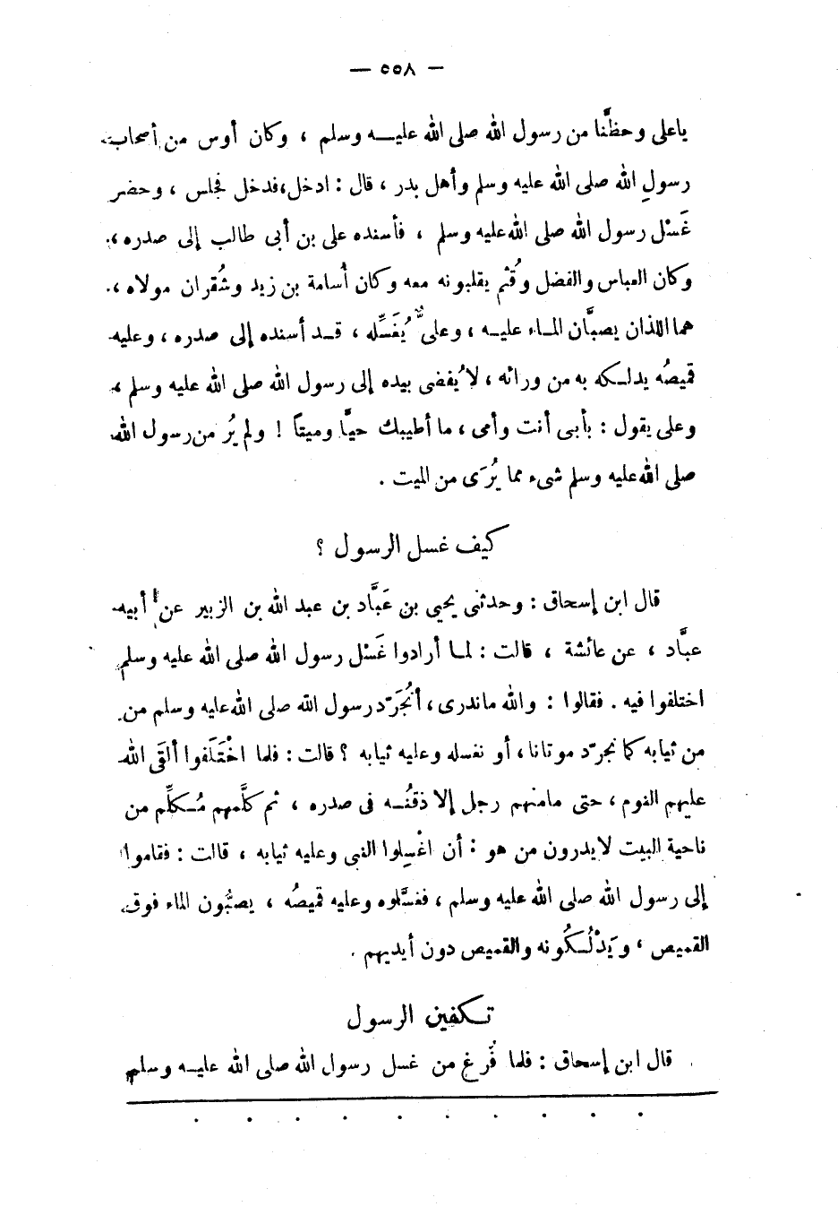 قَالَ ابْنُ إسْحَاقَ: وَحَدّثَنِي يحيى بن عباد بن عبد الله بن الزّبَيْرِ عَنْ أَبِيهِ عَبّادٍ، عَنْ عَائِشَةَ، قَالَتْ: لَمّا أَرَادُوا غَسْلَ رَسُولِ اللهِ صَلّى اللهُ عَلَيْهِ وَسَلّمَ اخْتَلَفُوا فِيهِ. فَقَالُوا: وَاَللهِ مَا نَدْرِي، أَنُجَرّدُ رَسُولَ اللهِ صَلّى اللهُ عَلَيْهِ وسلم من مِنْ ثِيَابِهِ كَمَا نُجَرّدُ مَوْتَانَا، أَوْ نُغَسّلُهُ وَعَلَيْهِ ثِيَابُهُ؟ قَالَتْ: فَلَمّا اخْتَلَفُوا أَلْقَى اللهُ عَلَيْهِمْ النّوْمَ، حَتّى مَا مِنْهُمْ رَجُلٌ إلّا ذَقْنُهُ فِي صَدْرِهِ، ثُمّ كَلّمَهُمْ مُكَلّمٌ مِنْ نَاحِيَةِ الْبَيْتِ لَا يَدْرُونَ مَنْ هُوَ: أَنْ اغْسِلُوا النّبِيّ وَعَلَيْهِ ثِيَابُهُ، قَالَتْ: فَقَامُوا إلَى رَسُولِ اللهِ صَلَّى اللَّهُ عَلَيْهِ وَسَلَّمَ، فَغَسّلُوهُ وَعَلَيْهِ قَمِيصُهُ، يَصُبّونَ الْمَاءَ فَوْقَ الْقَمِيصِ، وَيَدْلُكُونَهُ والقميص دون أيديهم.