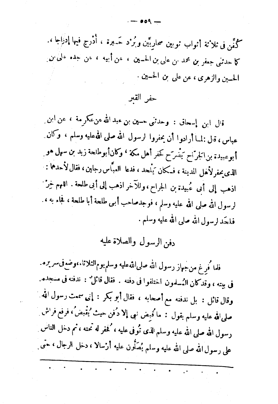 فَلَمّا فُرِغَ مِنْ جهاز رسول الله صلى الله عليه وسلم يوم الثلاثا، وُضِعَ فِي سَرِيرِهِ فِي بَيْتِهِ، وَقَدْ كَانَ الْمُسْلِمُونَ اخْتَلَفُوا فِي دَفْنِهِ. فَقَالَ قَائِلٌ: نَدْفِنُهُ فِي مَسْجِدِهِ وَقَالَ قَائِلٌ: بَلْ نَدْفِنُهُ مَعَ أَصْحَابِهِ، فَقَالَ أَبُو بَكْرٍ: إنّي سَمِعْت رَسُولَ اللهِ صَلَّى اللَّهُ عَلَيْهِ وَسَلّمَ يَقُولُ: مَا قُبِضَ نَبِيّ إلّا دُفِنَ حَيْثُ يُقْبَضُ، فَرُفِعَ فراش رَسُولِ اللهِ صَلّى اللهُ عَلَيْهِ وَسَلّمَ الّذِي تُوُفّيَ عَلَيْهِ، فَحُفِرَ لَهُ تَحْتَهُ، ثُمّ دَخَلَ النّاسِ عَلَى رَسُولِ اللهِ صَلَّى اللَّهُ عَلَيْهِ وَسَلّمَ يُصَلّونَ عَلَيْهِ أَرْسَالًا، دَخَلَ الرّجَالُ، حتى