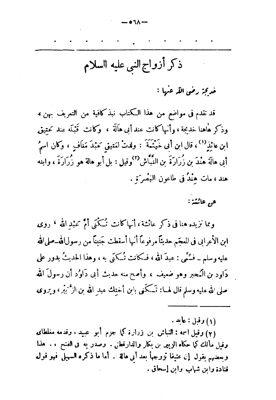 قَدْ تَقَدّمَ فِي مَوَاضِعَ مِنْ هَذَا الْكِتَابِ نُبَذٌ كَافِيَةٌ مِنْ التّعْرِيفِ بِهِنّ، وَذَكَرَ هَاهُنَا خَدِيجَةَ، وَأَنّهَا كَانَتْ عِنْدَ أَبِي هَالَةَ، وَكَانَتْ قَبْلَهُ عِنْدَ عُتَيّق ابن عَائِذٍ «1» ، قَالَ ابْنُ أَبِي خَيْثَمَةَ: وَلَدَتْ لِعُتَيّق عَبْدَ مَنَافٍ، وَكَانَ اسْمُ أَبِي هَالَةَ هِنْدَ بْنَ زُرَارَةَ بْنِ النّبّاشِ «2» وَقِيلَ: بَلْ أَبُو هَالَةَ هُوَ زُرَارَةُ، وَابْنُهُ هِنْدٌ، مَاتَ هِنْدٌ فى طاعون البصرة.