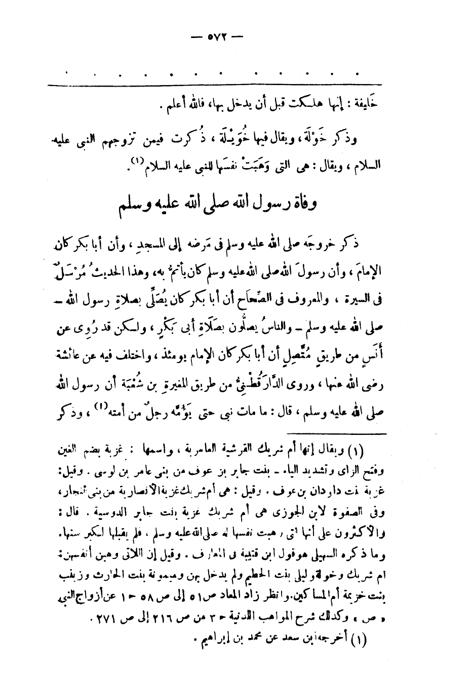 (1) ويقال إنها أم شريك القرشية العامرية، واسمها: غزبة بضم الغين وفتح الزاى وتشديد الياء- بنت جابر بن عوف من بنى عامر بن لوسى. وقيل: غزية بنت داودان بن عوف. وقيل: هى أم شريك غزية الأنصارية من بنى النجار، وفى الصفوة لابن الجوزى هى أم شريك عزية بنت جابر الدوسية. قال: والأكثرون على أنها التى وهبت نفسها له صلى الله عليه وسلم، فلم يقبلها لكبر سنها. وما ذكره السهيلى هو قول ابن قتيبة فى المعارف. وقيل إن اللاتى وهبن أنفسهن: ام شريك وخولة وليلى بنت الحطيم ولم يدخل بهن وميمونة بنت الحارث وزينب بنت خزيمة أم المساكين. وانظر زاد المعاد ص 1- إلى ص 58 ح 1 عن أزواج النبى «ص» وكذلك شرح المواهب المدنية ح 3 من ص 216 إلى ص 271.