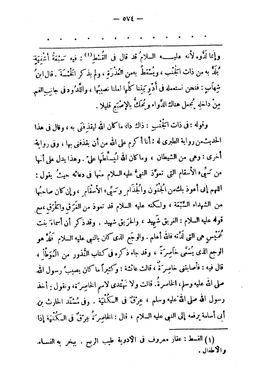 اللهُمّ إنّي أَعُوذُ بك من الجنون والجذام وسيّىء الْأَسْقَامِ، وَإِنْ كَانَ صَاحِبُهَا مِنْ الشّهَدَاءِ السّبْعَةِ، وَلَكِنّهُ عَلَيْهِ السّلَامُ قَدْ تَعَوّذَ مِنْ الْغَرَقِ وَالْحَرْقِ، مَعَ قَوْلِهِ عَلَيْهِ السّلَامُ: الْغَرِيقُ شَهِيدٌ، وَالْحَرِيقُ شَهِيدٌ. وَقَدْ ذَكَرَ أَنّ أَسْمَاءَ بِنْتَ عُمَيْسٍ هِيَ الّتِي لَدّتْهُ فَاَللهُ أَعْلَمُ. وَالْوَجَعُ الّذِي كَانَ بِالنّبِيّ عَلَيْهِ السّلَامُ فَلُدّ هُوَ الْوَجَعُ الّذِي يُسَمّى خَاصِرَةً، وَقَدْ جَاءَ ذِكْرُهُ فِي كِتَابِ النّذُورِ مِنْ الْمُوَطّأِ، قَالَ فِيهِ: فَأَصَابَتْنِي خَاصِرَةٌ، قَالَتْ عَائِشَةُ: وَكَثِيرًا مَا كَانَ يُصِيبُ رَسُولَ اللهِ صَلَّى اللَّهُ عَلَيْهِ وَسَلَّمَ، الْخَاصِرَةُ. قَالَتْ وَلَا نَهْتَدِي لِاسْمِ الْخَاصِرَةِ، وَنَقُولُ: أخذ رسول الله صلى الله عليه وسلم، عِرْقٌ فِي الْكُلّيّةِ. وَفِي مُسْنَدِ الْحَارِثِ بْنِ أَبِي أُسَامَةَ يَرْفَعُهُ إلَى النّبِيّ عَلَيْهِ السّلَامُ، قال: الخاصرة عرق فى الكلية إذا