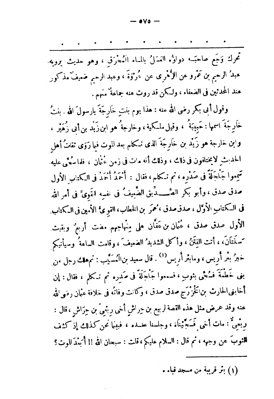 وَقَوْلُ أَبِي بَكْرٍ رَضِيَ اللهُ عَنْهُ: هَذَا يَوْمُ بِنْتِ خَارِجَةَ يَا رَسُولَ اللهِ. بِنْتُ خَارِجَةَ اسْمُهَا: حَبِيبَةُ، وَقِيلَ مَلَكِيّة، وَخَارِجَةُ هُوَ ابْنُ زَيْدِ بْنِ أَبِي زُهَيْرٍ، وَابْنُ خَارِجَةَ هُوَ زَيْدُ بْنُ خَارِجَةَ الّذِي تَكَلّمَ بَعْدَ الْمَوْتِ فِيمَا رَوَى ثِقَاتُ أَهْلِ الْحَدِيثِ لَا يَخْتَلِفُونَ فِي ذَلِكَ، وَذَلِكَ أَنّهُ مَاتَ فِي زَمَنِ عُثْمَانَ، فَلَمّا سخى؟؟؟ عَلَيْهِ سَمِعُوا جَلْجَلَةً فِي صَدْرِهِ، ثُمّ تَكَلّمَ، فَقَالَ: أَحْمَدُ أَحْمَدُ فِي الْكِتَابِ الْأَوّلِ صِدْقٌ صِدْقٌ، وَأَبُو بَكْرٍ الصّدّيقُ الضّعِيفُ فِي نَفْسِهِ الْقَوِيّ فِي أَمْرِ اللهِ فِي؟؟؟ الْكِتَابِ الْأَوّلِ، صِدْقٌ صِدْقٌ، عُمَرُ بْنُ الْخَطّابِ، الْقَوِيّ الْأَمِينُ فِي الْكِتَابِ الْأَوّلِ صِدْقٌ صِدْقٌ، عُثْمَانُ بْنُ عَفّانَ عَلَى مِنْهَاجِهِمْ مَضَتْ أَرْبَعٌ وَبَقِيَتْ سَنَتَانِ،، أَتَتْ الْفِتَنُ، وَأَكَلَ الشّدِيدُ الضّعِيفَ، وَقَامَتْ السّاعَةُ وسيأتيكم عبر بِئْرِ أَرِيسَ، وَمَا بِئْرُ أَرِيسَ «1» . قَالَ سَعِيدُ بْنُ الْمُسَيّبِ: ثُمّ هَلَكَ رَجُلٌ مِنْ بَنِي خَطْمَةَ فَسُجّيَ بِثَوْبِ، فَسَمِعُوا جَلْجَلَةً فِي صَدْرِهِ ثُمّ تَكَلّمَ، فَقَالَ: إنّ أَخَا بَنِي الْحَارِثِ بْنِ الْخَزْرَجِ صِدْقٌ صِدْقٌ، وَكَانَتْ وَفَاتُهُ فِي خِلَافَةِ عُثْمَانَ رَضِيَ اللهُ عَنْهُ وَقَدْ عُرِضَ مِثْلُ هَذِهِ الْقِصّةِ لِرَبِيعِ بْنِ حِرَاشٍ أَخِي رِبْعِيّ بْنِ حِرَاشٍ، قَالَ: