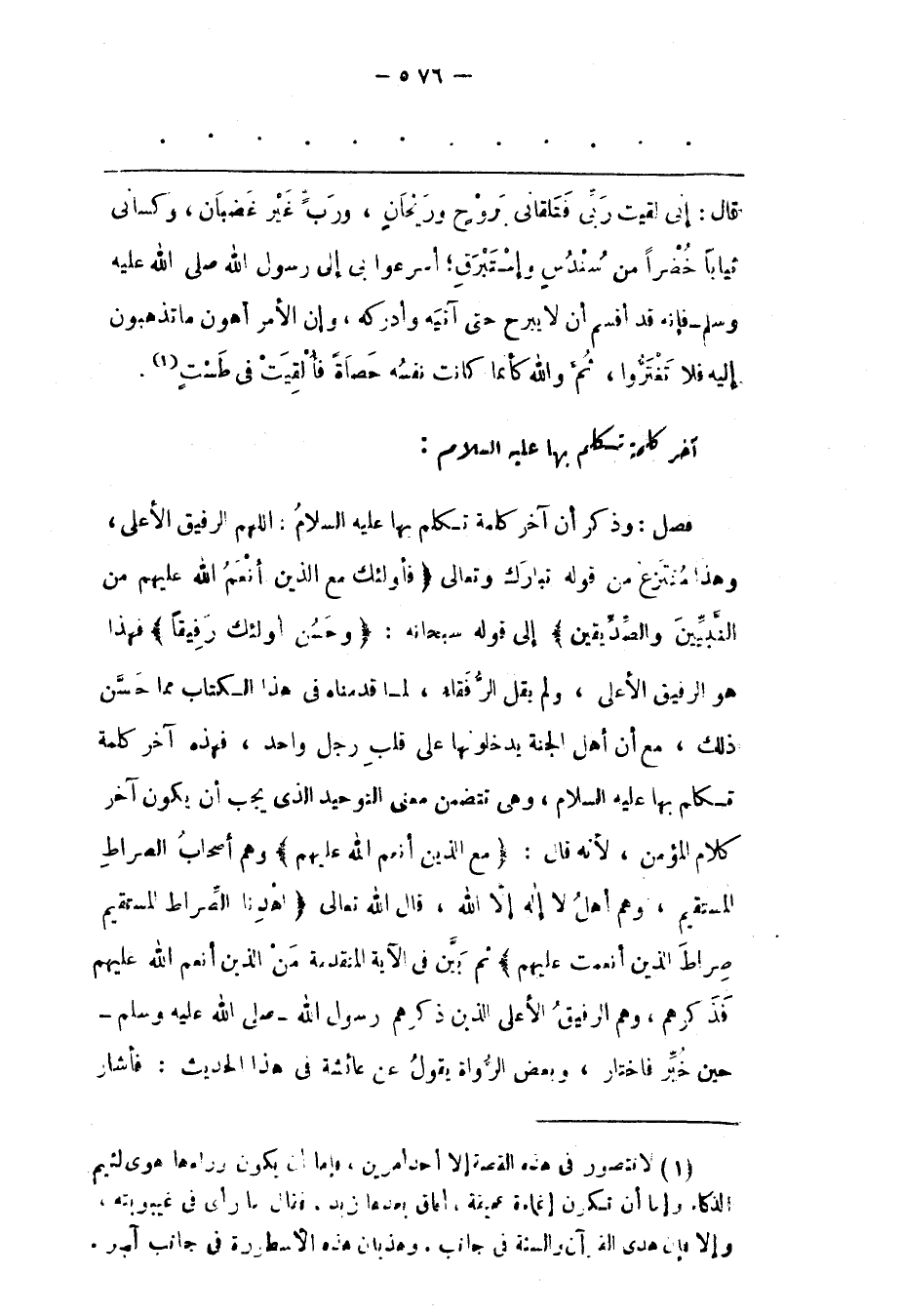 فَصْلٌ: وَذَكَرَ أَنّ آخِرَ كَلِمَةٍ تَكَلّمَ بِهَا عَلَيْهِ السّلَامُ: اللهُمّ الرّفِيقَ الْأَعْلَى، وَهَذَا مُنْتَزَعٌ مِنْ قَوْلِهِ تَبَارَكَ وَتَعَالَى فَأُولئِكَ مَعَ الَّذِينَ أَنْعَمَ اللَّهُ عَلَيْهِمْ مِنَ النَّبِيِّينَ وَالصِّدِّيقِينَ إلى قوله سبحانه: وَحَسُنَ أُولئِكَ رَفِيقاً فَهَذَا هُوَ الرّفِيقُ الْأَعْلَى، وَلَمْ يَقُلْ الرّفَقَاءُ، لِمَا قَدّمْنَاهُ فِي هَذَا الْكِتَابِ مِمّا حَسُنَ ذَلِكَ، مَعَ أَنّ أَهْلَ الْجَنّةِ يُدْخِلُونَهَا عَلَى قَلْبِ رَجُلٍ وَاحِدٍ، فَهَذِهِ آخِرُ كَلِمَةٍ تَكَلّمَ بِهَا عَلَيْهِ السّلَامُ، وَهِيَ تَتَضَمّنُ مَعْنَى التّوْحِيدِ الّذِي يَجِبُ أَنْ يَكُونَ آخِرَ كَلَامِ الْمُؤْمِنِ، لِأَنّهُ قَالَ: مَعَ الَّذِينَ أَنْعَمَ اللَّهُ عَلَيْهِمْ وَهُمْ أَصْحَابُ الصّرَاطِ الْمُسْتَقِيمِ، وَهُمْ أَهْلُ لَا إلَهَ إلّا اللهُ، قَالَ اللهُ تَعَالَى اهْدِنَا الصِّراطَ الْمُسْتَقِيمَ صِراطَ الَّذِينَ أَنْعَمْتَ عَلَيْهِمْ ثُمّ بَيّنَ فِي الْآيَةِ الْمُتَقَدّمَةِ مِنْ الّذِينَ أَنْعَمَ اللهُ عَلَيْهِمْ فَذَكَرَهُمْ، وَهُمْ الرّفِيقُ الْأَعْلَى الذين ذَكَرَهُمْ رَسُولُ اللهِ- صَلَّى اللَّهُ عَلَيْهِ وَسَلَّمَ- حين خبّر فَاخْتَارَ، وَبَعْضُ الرّوَاةِ يَقُولُ عَنْ عَائِشَةَ فِي هذا الحديث: فأشار
