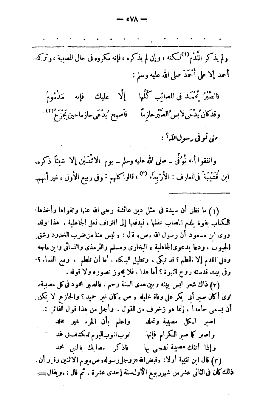 (2) ذاك شعر ليس بينه وبين هدى السنة رحم. فالصبر محمود فى كل مصيبة. ترى أكان صبر أبى بكر على وفاة خليله «ص» كان غير حميد؟ والجازع لا يمكن أن يسمى حامدا، إنما هو زخرف من القول. وأجمل من هذا قول القائر: