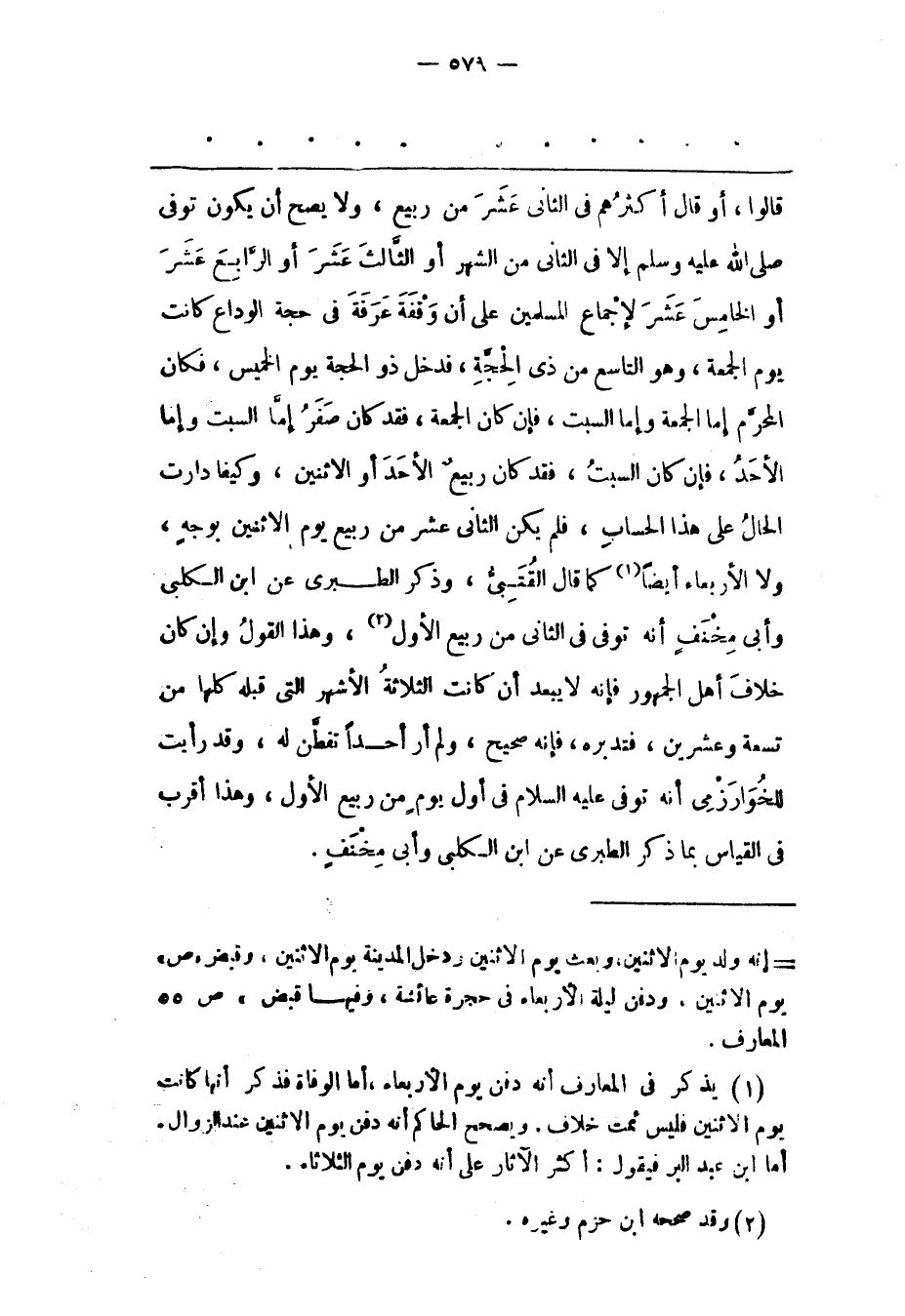 قَالُوا، أَوْ قَالَ أَكْثَرُهُمْ فِي الثّانِي عَشَرَ مِنْ رَبِيعٍ، وَلَا يَصِحّ أَنْ يَكُونَ تُوُفّيَ صَلَّى اللَّهُ عَلَيْهِ وَسَلَّمَ إلّا فِي الثّانِي مِنْ الشّهْرِ أَوْ الثّالِثَ عَشَرَ أَوْ الرّابِعَ عَشَرَ أَوْ الْخَامِسَ عَشَرَ لِإِجْمَاعِ الْمُسْلِمِينَ عَلَى أَنّ وَقْفَةَ عَرَفَةَ فِي حَجّةِ الْوَدَاعِ كَانَتْ يَوْمَ الْجُمُعَةِ، وَهُوَ التّاسِعُ مِنْ ذِي الْحَجّةِ، فَدَخَلَ ذُو الْحَجّةِ يَوْمَ الْخَمِيسِ، فَكَانَ الْمُحَرّمُ إمّا الْجُمُعَةُ وَإِمّا السّبْتُ، فَإِنْ كَانَ الْجُمُعَةُ، فَقَدْ كَانَ صَفَرٌ إمّا السّبْتُ وَإِمّا الْأَحَدُ، فَإِنْ كَانَ السّبْتُ، فَقَدْ كَانَ رَبِيعٌ الْأَحَدَ أَوْ الِاثْنَيْنِ، وَكَيْفَا دَارَتْ الْحَالُ عَلَى هَذَا الْحِسَابِ، فَلَمْ يَكُنْ الثّانِي عَشَرَ مِنْ رَبِيعٍ يَوْمَ الِاثْنَيْنِ بِوَجْهِ، وَلَا الْأَرْبِعَاءَ أَيْضًا «1» كَمَا قَالَ الْقُتَبِيّ، وَذَكَرَ الطّبَرِيّ عَنْ ابْنِ الْكَلْبِيّ وَأَبِي مِخْنَفٍ أَنّهُ تُوُفّيَ فِي الثّانِي مِنْ رَبِيعٍ الْأَوّلِ «2» ، وَهَذَا الْقَوْلُ وَإِنْ كَانَ خِلَافَ أَهْلِ الْجُمْهُورِ فَإِنّهُ لَا يُبْعَدُ أَنْ كَانَتْ الثّلَاثَةُ الْأَشْهُرُ الّتِي قَبْلَهُ كُلّهَا مِنْ تِسْعَةٍ وَعِشْرِينَ، فَتَدَبّرْهُ، فَإِنّهُ صَحِيحٌ، وَلَمْ أَرَ أَحَدًا تَفَطّنَ لَهُ، وَقَدْ رَأَيْت لِلْخَوَارِزْمِيّ أَنّهُ تُوُفّيَ عَلَيْهِ السّلَامُ فِي أَوّلِ يَوْمٍ مِنْ رَبِيعٍ الْأَوّلِ، وَهَذَا أَقْرَبُ فِي الْقِيَاسِ بِمَا ذَكَرَ الطّبَرِيّ عَنْ ابْنِ الْكَلْبِيّ وَأَبِي مِخْنَفٍ.