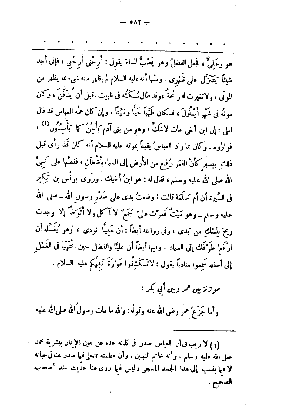 (1) لا ريب فى أن العباس صدر فى كلمته هذه عن يقين الإيمان ببشرية محمد صلى الله عليه وسلم، وأنه خاتم النبيين، وأن عظمته تتجلى فيما صدر عنه فى حياته لا فيما ينسب إلى هذا الجسد المسجى وليس فيما روى هنا حديث عند أصحاب الصحيح.