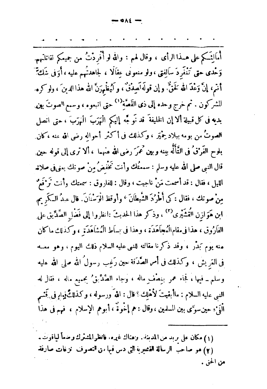 أُمَالِئَكُمْ عَلَى هَذَا الرّأْيِ، وَقَالَ لَهُمْ: وَاَللهِ لَوْ أَفْرَدْت مِنْ جَمِيعِكُمْ لَقَاتَلْتهمْ وَحْدِي حَتّى تَنْفَرِدَ سَالِفَتِي، وَلَوْ مَنَعُونِي عِقَالًا، لَجَاهَدْتهمْ عَلَيْهِ، أو فى شَكّ أَنْتُمْ، أَنّ وَعَدَ اللهِ لَحَقّ. وَإِنّ قَوْلَهُ لَصِدْقٌ، وَلَيُظْهِرَنّ اللهُ هَذَا الدّينَ، وَلَوْ كَرِهَ الْمُشْرِكُونَ. ثُمّ خَرَجَ وَحْدَهُ إلَى ذِي الْقِصّةِ «1» حَتّى اتّبَعُوهُ، وَسَمِعَ الصّوْتَ بَيْنَ يَدَيْهِ فِي كُلّ قَبِيلَةٍ أَلَا إنّ الْخَلِيفَةَ قَدْ تَوَجّهَ إلَيْكُمْ الْهَرَبَ الْهَرَبَ، حَتّى اتّصَلَ الصّوْتُ مِنْ يَوْمِهِ بِبِلَادِ حِمْيَرَ، وَكَذَلِكَ فِي أَكْثَرِ أَحْوَالِهِ رَضِيَ اللهُ عَنْهُ، كَانَ يَلُوحُ الْفَرَقُ فِي التّأَلّهِ بَيْنَهُ وَبَيْنَ عُمَرَ رَضِيَ اللهُ عَنْهُمَا، أَلَا تَرَى إلَى قَوْلِهِ حِينَ قَالَ النّبِيّ صَلَّى اللَّهُ عَلَيْهِ وَسَلَّمَ: سَمِعْتُك وَأَنْتَ تَخْفِضُ مِنْ صَوْتِك يَعْنِي فِي صَلَاةِ اللّيْلِ، فقال: قد أسمعت من ناحجيت، وَقَالَ: لِلْفَارُوقِ: سَمِعْتُك وَأَنْتَ تَرْفَعُ مِنْ صَوْتِك، فَقَالَ: كَيْ أَطْرُدَ الشّيْطَانَ، وَأُوقِظَ الْوَسْنَانَ. قَالَ عبد الكريم ابن هَوَازِنَ الْقُشَيْرِيّ «2» ، وَذَكَرَ هَذَا الْحَدِيثَ: اُنْظُرُوا إلَى فَضْلِ الصّدّيقِ عَلَى الْفَارُوقِ، هَذَا فِي مَقَامِ الْمُجَاهَدَةِ، وَهَذَا فِي بِسَاطِ الْمُشَاهَدَةِ، وَكَذَلِكَ مَا كَانَ مِنْهُ يَوْمَ بَدْرٍ، وَقَدْ ذَكَرْنَا مَقَالَتَهُ لِلنّبِيّ عَلَيْهِ السّلَامُ ذَلِكَ الْيَوْمَ، وَهُوَ مَعَهُ فِي الْعَرِيشِ، وَكَذَلِكَ فِي أَمْرِ الصّدَقَةِ حِينَ رَغِبَ رَسُولُ اللهِ صَلَّى اللَّهُ عَلَيْهِ وَسَلَّمَ- فِيهَا، فَجَاءَ عُمَرُ بِنِصْفِ مَالِهِ، وَجَاءَ الصّدّيقُ بِجَمِيعِ مَالِهِ، فَقَالَ لَهُ النّبِيّ عَلَيْهِ السّلَامُ: مَا أَبْقَيْت لِأَهْلِك؟ قَالَ: اللهَ وَرَسُولَهُ، وَكَذَلِكَ فَعَلَهُ فِي قِسْمِ الْفَيْءِ حِينَ سَوّى بَيْنَ الْمُسْلِمِينَ، وَقَالَ: هُمْ إخْوَةٌ، أَبُوهُمْ الْإِسْلَامُ، فَهُمْ فى هذا