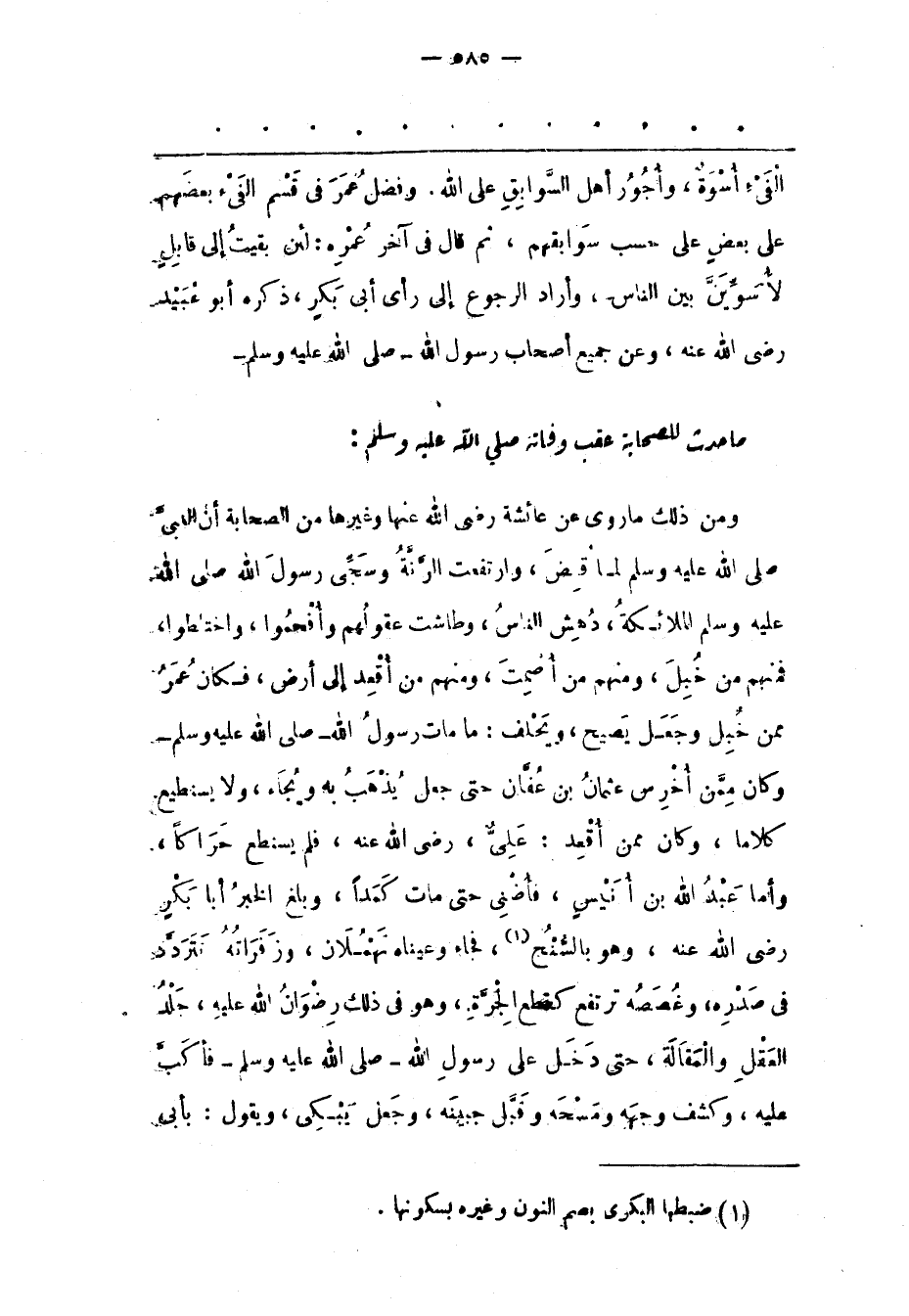 وَمِنْ ذَلِكَ مَا رُوِيَ عَنْ عَائِشَةَ رَضِيَ اللهُ عَنْهَا وَغَيْرِهَا مِنْ الصّحَابَةِ أَنّ النّبِيّ صَلَّى اللَّهُ عَلَيْهِ وَسَلَّمَ لَمّا قُبِضَ، وَارْتَفَعَتْ الرّنّةُ وَسَجّى رَسُولَ اللهِ صَلَّى اللَّهُ عَلَيْهِ وَسَلَّمَ الْمَلَائِكَةَ، دُهِشَ الناس، وطاشت عقولهم وأفحموا، وَاخْتَلَطُوا، فَمِنْهُمْ مَنْ خُبِلَ، وَمِنْهُمْ مَنْ أُصْمِتَ، وَمِنْهُمْ مَنْ أُقْعِدَ إلَى أَرْضٍ، فَكَانَ عُمَرُ مِمّنْ خُبِلَ وَجَعَلَ يَصِيحُ، وَيَحْلِفُ: مَا مَاتَ رَسُولُ اللهِ- صَلّى اللهُ عَلَيْهِ وَسَلّمَ- وكان مِمّنْ أُخْرِسَ عُثْمَانُ بْنُ عَفّانَ حَتّى جَعَلَ يُذْهَبُ بِهِ وَيُجَاءُ، وَلَا يَسْتَطِيعُ كَلَامًا، وَكَانَ مِمّنْ أُقْعِدَ: عَلِيّ، رَضِيَ اللهُ عَنْهُ، فَلَمْ يَسْتَطِعْ حَرَاكًا، وَأَمّا عَبْدُ اللهِ بْنُ أُنَيْسٍ، فَأُضْنِيَ حَتّى مَاتَ كَمَدًا، وَبَلَغَ الْخَبَرُ أَبَا بَكْرٍ رَضِيَ اللهُ عَنْهُ، وَهُوَ بِالسّنْحِ «1» ، فَجَاءَ وعيناه نهملان، وزفراته نتردّد فِي صَدْرِهِ، وَغُصَصُهُ تَرْتَفِعُ كَقِطَعِ الْجِرّةِ، وَهُوَ فِي ذَلِكَ رِضْوَانُ اللهِ عَلَيْهِ، جَلْدُ الْعَقْلِ وَالْمَقَالَةِ، حَتّى دَخَلَ عَلَى رَسُولِ اللهِ- صَلَّى اللَّهُ عَلَيْهِ وَسَلَّمَ- فَأَكَبّ عَلَيْهِ، وَكَشَفَ وَجْهَهُ وَمَسَحَهُ وَقَبّلَ جَبِينَهُ، وَجَعَلَ يَبْكِي، وَيَقُولُ: بِأَبِي