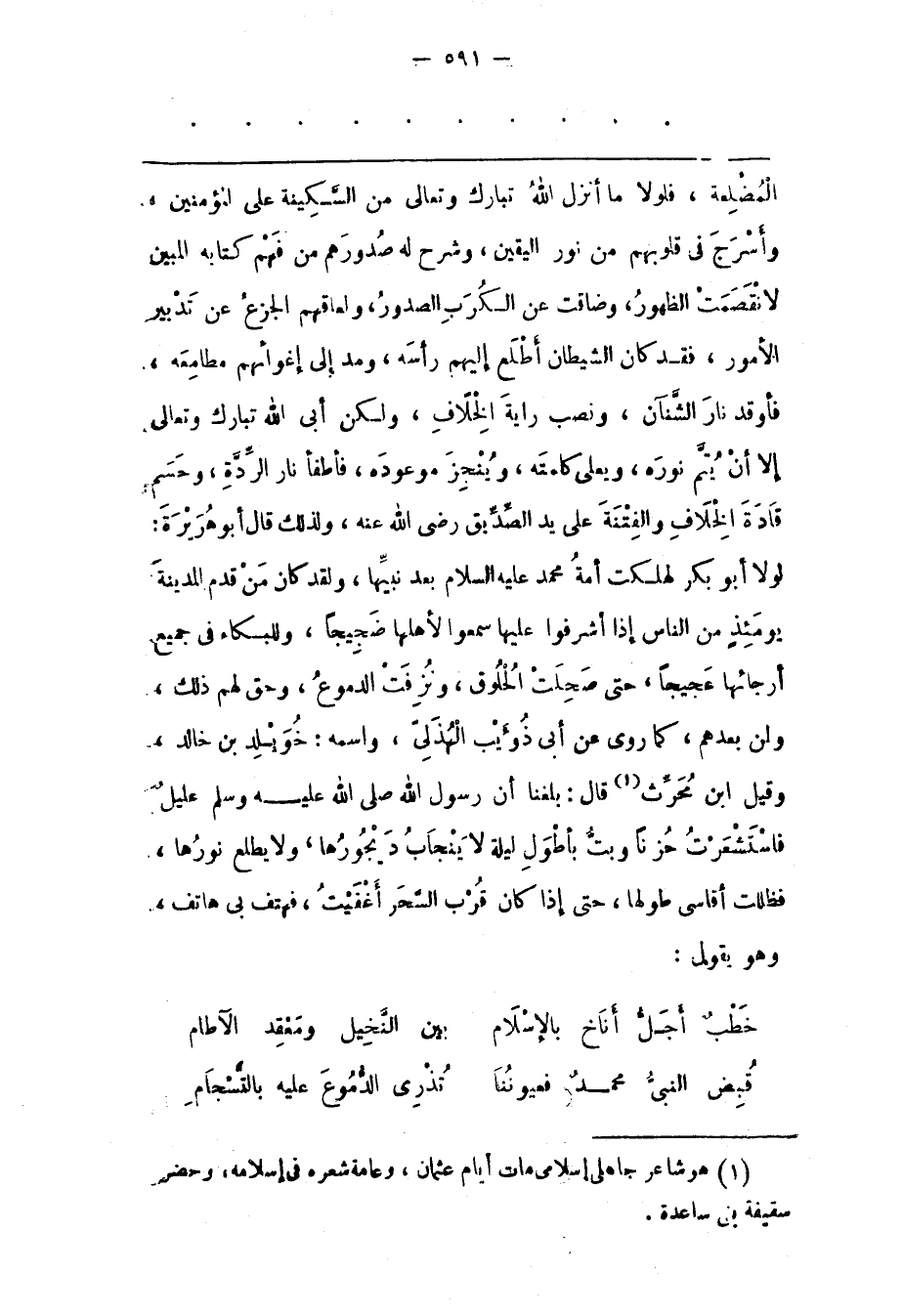 لَوْلَا أَبُو بَكْرٍ لَهَلَكَتْ أُمّةُ مُحَمّدٍ عَلَيْهِ السّلَامُ بَعْدَ نَبِيّهَا، وَلَقَدْ كَانَ مِنْ قَدِمَ الْمَدِينَةَ يَوْمئِذٍ مِنْ النّاسِ إذَا أَشْرَفُوا عَلَيْهَا سَمِعُوا لِأَهْلِهَا ضَجِيجًا، وَلِلْبُكَاءِ فِي جَمِيعِ أَرْجَائِهَا عَجِيجًا، حَتّى صَحِلَتْ الحلوق، ونزفت الدموع، وحق لهم ذلك، وان بَعْدَهُمْ، كَمَا رُوِيَ عَنْ أَبِي ذُؤَيْبٍ الْهُذَلِيّ، وَاسْمُهُ: خُوَيْلِدُ بْنُ خَالِدٍ، وَقِيلَ ابْنُ مُحَرّثٍ «1» قَالَ: بَلَغَنَا أَنّ رَسُولَ اللهِ صَلَّى اللَّهُ عَلَيْهِ وَسَلَّمَ عَلِيلٌ فَاسْتَشْعَرْت حُزْنًا وَبِتّ بِأَطْوَلِ لَيْلَةٍ لَا يَنْجَابُ دَيْجُورُهَا، وَلَا يَطْلُعُ نُورُهَا، فَظَلِلْت أُقَاسِي طُولَهَا، حَتّى إذَا كَانَ قُرْبُ السّحَرِ أَغْفَيْت، فَهَتَفَ بِي هَاتِفٌ، وَهُوَ يَقُولُ: