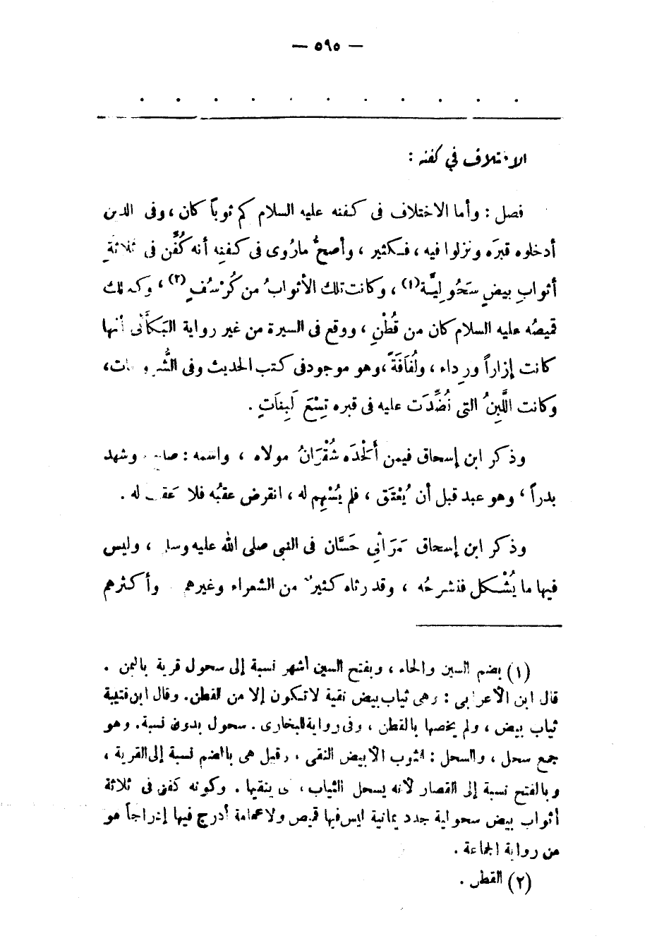 (1) بضم السين والحاء، وبفتح السين أشهر نسبة إلى سحول قرية باليمن. قال ابن الأعرابى: وهى ثياب بيض نقية لا تكون إلا من القطن. وقال ابن قتيبة ثياب بيض، ولم يخصها بالقطن، وفى رواية للبخارى. سحول بدون نسبة. وهو جمع سحل، والسحل: الثوب الأبيض النقى، وقيل هى بالضم نسبة إلى القرية، وبالفتح نسبة إلى القصار لأنه يسحل الثياب، ى ينقيها. وكونه كفن فى ثلاثة أثواب بيض سحولية جدد يمانية ليس فيها قميص ولا عمامة أدرج فيها إدراجا هو من رواية الجماعة.