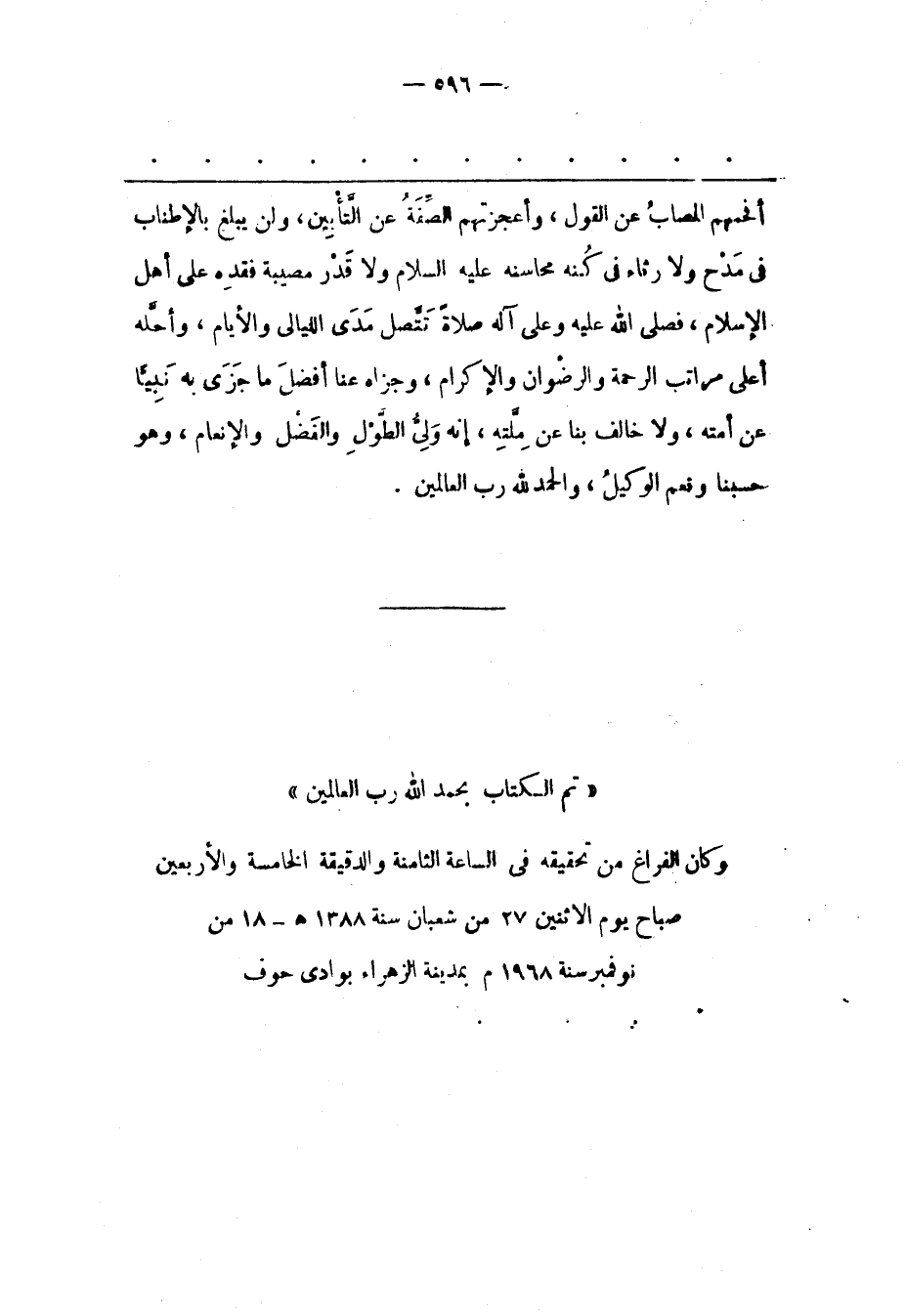 «تم الكتاب بحمد الله رب العالمين» وكان الفراغ من تحقيقه فى الساعة الثامنة والدقيقة الخامسة والأربعين صباح يوم الاثنين 27 من شعبان سنة 1388 هـ- 18 من نوفمبر سنة 1968 م بمدينة الزهراء بوادى حوف