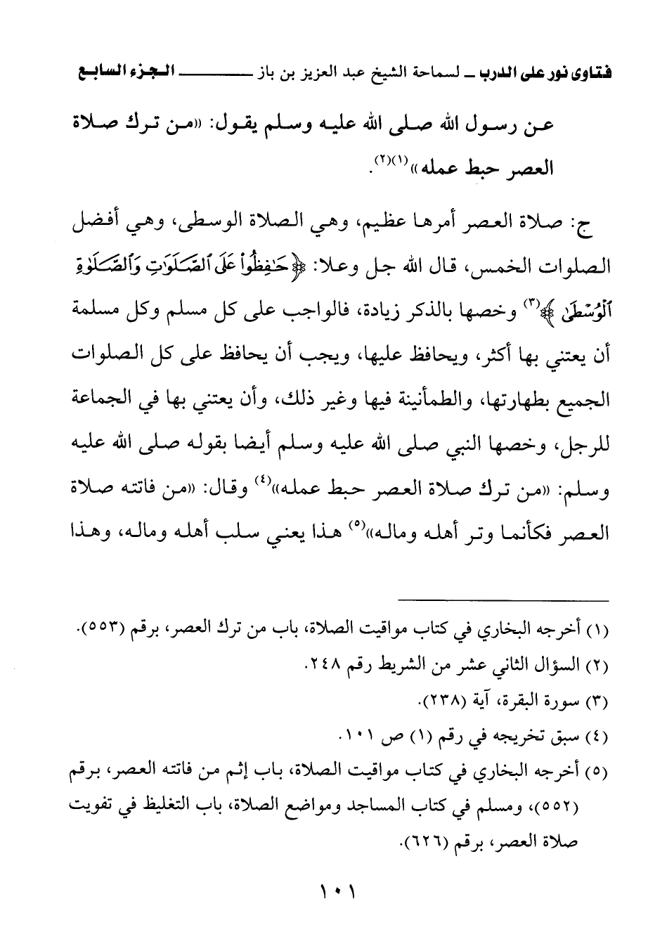 ج: صلاة العصر أمرها عظيم، وهي الصلاة الوسطى، وهي أفضل الصلوات الخمس، قال الله جل وعلا: {حَافِظُوا عَلَى الصَّلَوَاتِ وَالصَّلَاةِ الْوُسْطَى} (¬3) وخصها بالذكر زيادة، فالواجب على كل مسلم وكل مسلمة أن يعتني بها أكثر، ويحافظ عليها، ويجب أن يحافظ على كل الصلوات الجميع بطهارتها، والطمأنينة فيها وغير ذلك، وأن يعتني بها في الجماعة للرجل، وخصها النبي - صلى الله عليه وسلم - أيضا بقوله - صلى الله عليه وسلم -: «من ترك صلاة العصر حبط عمله (¬4)» وقال: «من فاتته صلاة العصر فكأنما وتر أهله وماله (¬5)» هذا يعني سلب أهله وماله، وهذا