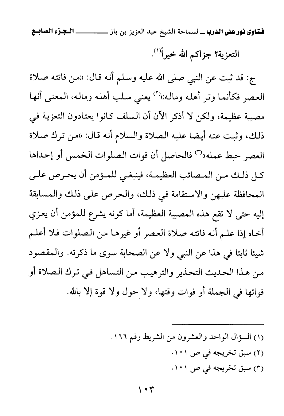 ج: قد ثبت عن النبي - صلى الله عليه وسلم - أنه قال: «من فاتته صلاة العصر فكأنما وتر أهله وماله (¬2)» يعني سلب أهله وماله، المعنى أنها مصبية عظيمة، ولكن لا أذكر الآن أن السلف كانوا يعتادون التعزية في ذلك، وثبت عنه أيضا عليه الصلاة والسلام أنه قال: «من ترك صلاة العصر حبط عمله (¬3)»