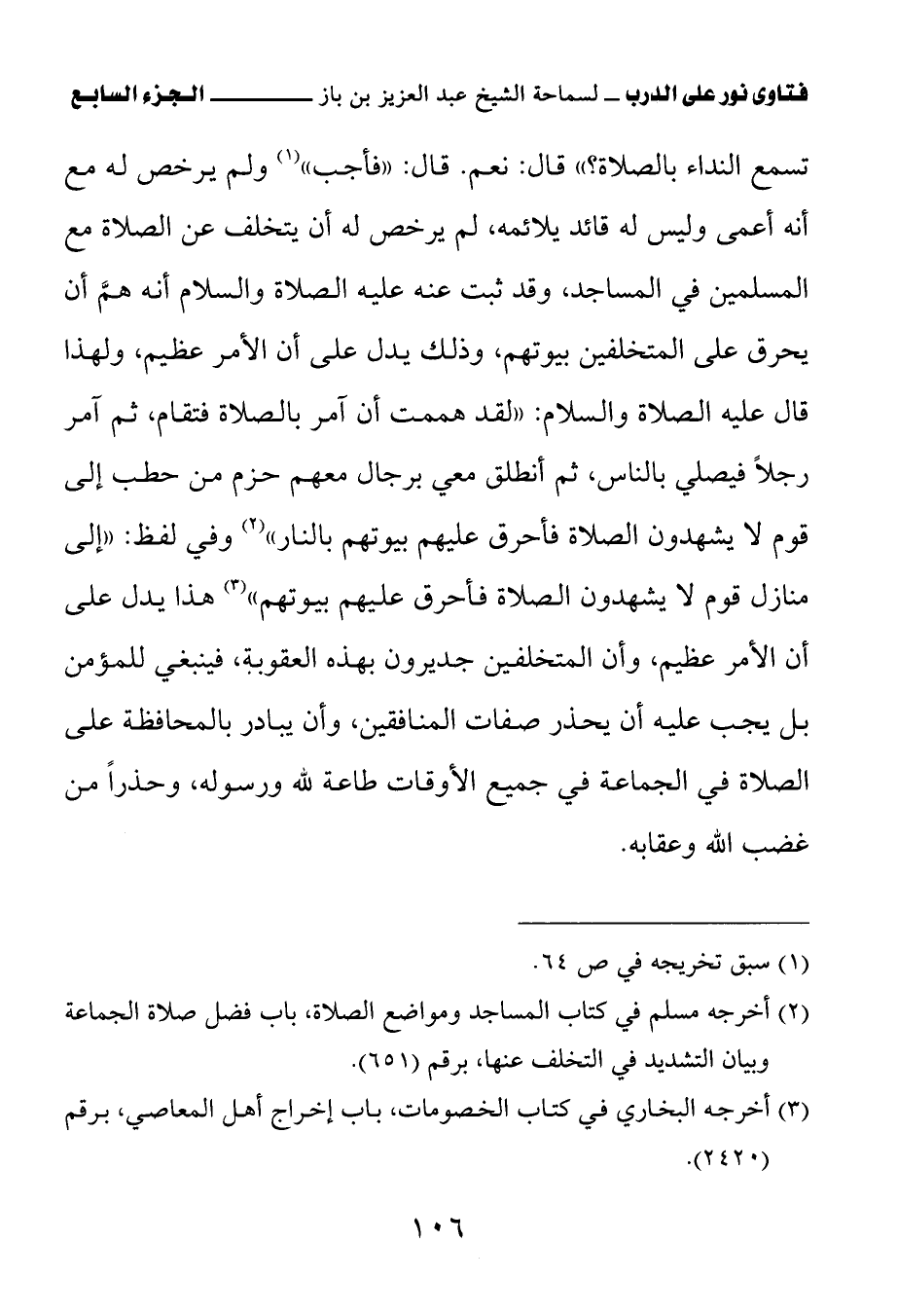 تسمع النداء بالصلاة، قال: نعم. قال: فأجب (¬1)» ولم يرخص له مع أنه أعمى، وليس له قائد يلائمه، لم يرخص له أن يتخلف عن الصلاة مع المسلمين في المساجد، وقد ثبت عنه عليه الصلاة والسلام أنه هم أن يحرق على المتخلفين بيوتهم، وذلك يدل على أن الأمر عظيم، ولهذا قال عليه الصلاة والسلام: «لقد هممت أن آمر بالصلاة فتقام، ثم آمر رجلا فيصلي بالناس، ثم أنطلق معي برجال معهم حزم من حطب إلى قوم لا يشهدون الصلاة فأحرق عليهم بيوتهم بالنار (¬2)» وفي لفظ: «إلى منازل قوم لا يشهدون الصلاة فأحرق عليهم بيوتهم (¬3)» هذا يدل على أن الأمر عظيم، وأن المتخلفين جديرون بهذه العقوبة، فينبغي للمؤمن؛ بل يجب عليه أن يحذر صفات المنافقين، وأن يبادر بالمحافظة على الصلاة في الجماعة في جميع الأوقات طاعة لله ورسوله، وحذرا من غضب الله وعقابه.