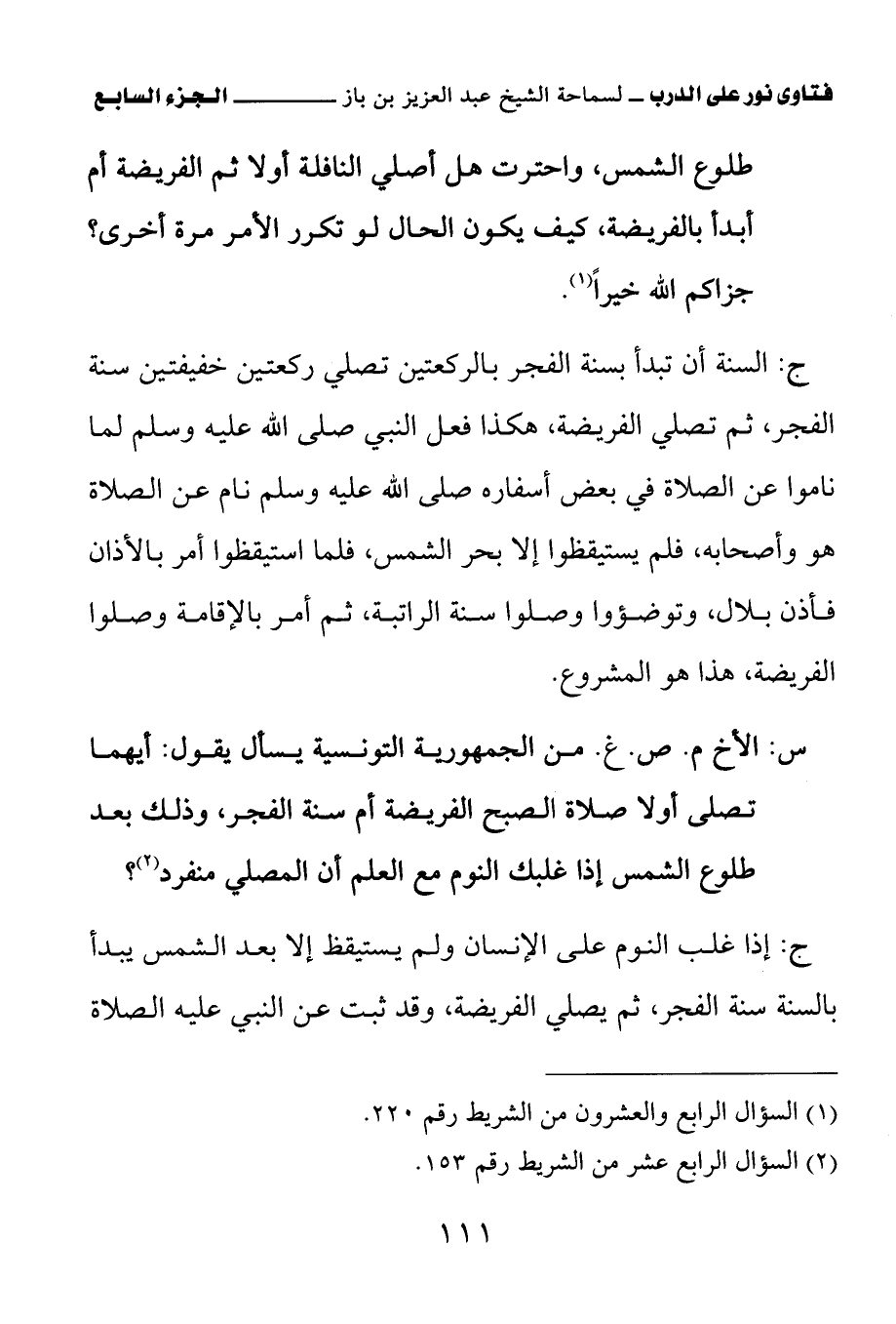 س: الأخ: م. ص. غ. من الجمهورية التونسية يسأل يقول: أيهما تصلى أولا صلاة الصبح الفريضة أم سنة الفجر، وذلك بعد طلوع الشمس إذا غلبك النوم مع العلم أن المصلي منفرد (¬2)؟