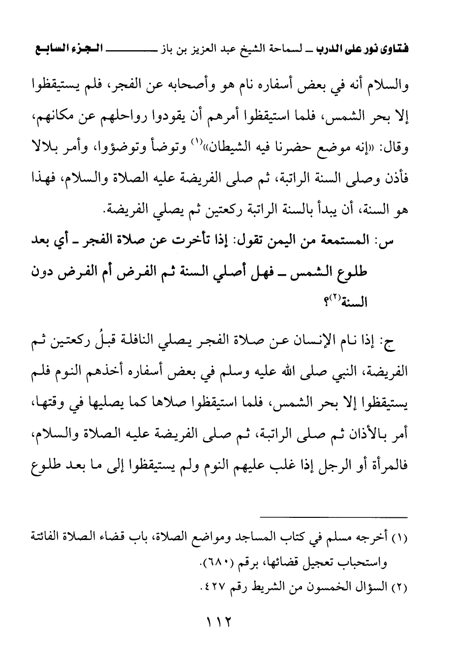 س: المستمعة من اليمن تقول: إذا تأخرت عن صلاة الفجر – أي بعد طلوع الشمس – فهل أصلي السنة، ثم الفرض أم الفرض دون السنة (¬2)؟