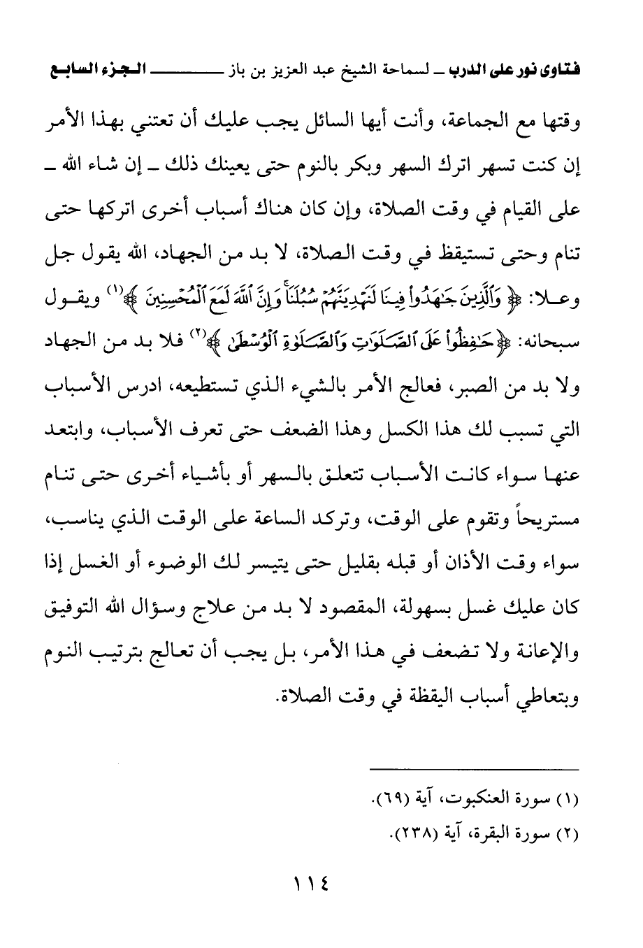وقتها مع الجماعة، وأنت أيها السائل يجب عليك أن تعتني بهذا الأمر إن كنت تسهر اترك السهر، وبكر بالنوم حتى يعينك ذلك – إن شاء الله – على القيام في وقت الصلاة، وإن كان هناك أسباب أخرى اتركها حتى تنام، وحتى تستيقظ في وقت الصلاة، لا بد من الجهاد، الله يقول جل وعلا: {وَالَّذِينَ جَاهَدُوا فِينَا لَنَهْدِيَنَّهُمْ سُبُلَنَا وَإِنَّ اللَّهَ لَمَعَ الْمُحْسِنِينَ} (¬1) ويقول سبحانه: {حَافِظُوا عَلَى الصَّلَوَاتِ وَالصَّلَاةِ الْوُسْطَى} (¬2)؛ فلا بد من الجهاد، ولا بد من الصبر، فعالج الأمر بالشيء الذي تستطيعه، ادرس الأسباب التي تسبب لك هذا الكسل، وهذا الضعف حتى تعرف الأسباب، وابتعد عنها سواء كانت الأسباب تتعلق بالسهر، أو بأشياء أخرى؛ حتى تنام مستريحا، وتقوم على الوقت، وتركد الساعة على الوقت الذي يناسب، سواء وقت الأذان أو قبله بقليل، حتى يتيسر لك الوضوء أو الغسل إذا كان عليك غسل بسهولة، المقصود لا بد من علاج، وسؤال الله التوفيق والإعانة، ولا تضعف في هذا الأمر؛ بل يجب أن تعالج بترتيب النوم، وبتعاطي أسباب اليقظة في وقت الصلاة.