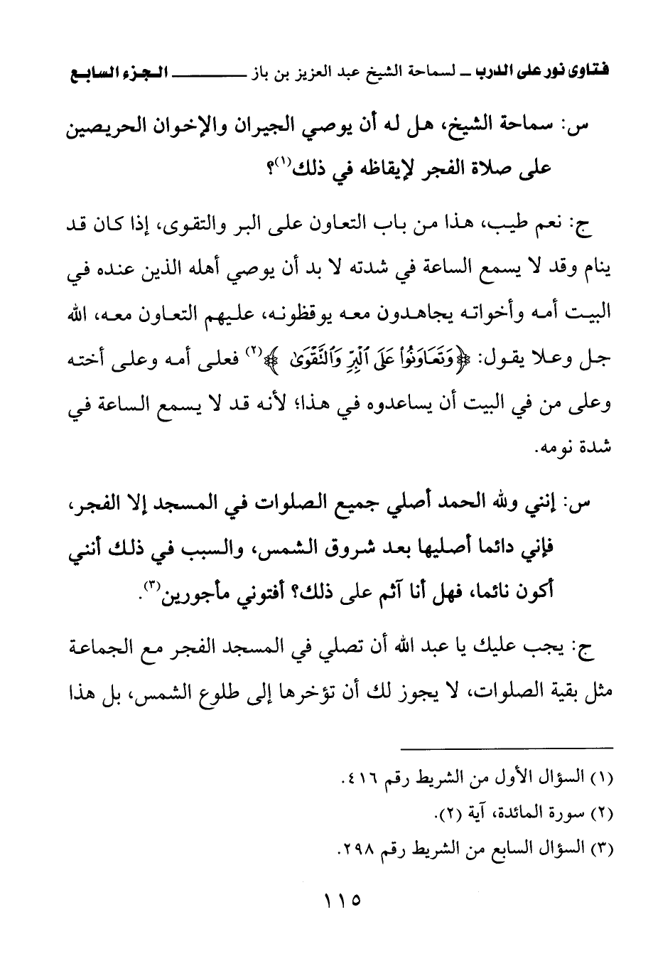 ج: نعم، طيب هذا، من باب التعاون على البر والتقوى، إذا كان قد ينام وقد لا يسمع الساعة في شدته، لا بد أن يوصي أهله الذين عنده في البيت: أمه، وأخواته يجاهدون معه، يوقظونه، عليهم التعاون معه، الله جل وعلا يقول: {وَتَعَاوَنُوا عَلَى الْبِرِّ وَالتَّقْوَى} (¬2) فعلى أمه وعلى أخته وعلى من في البيت أن يساعدوه في هذا؛ لأنه قد لا يسمع الساعة في شدة نومه.