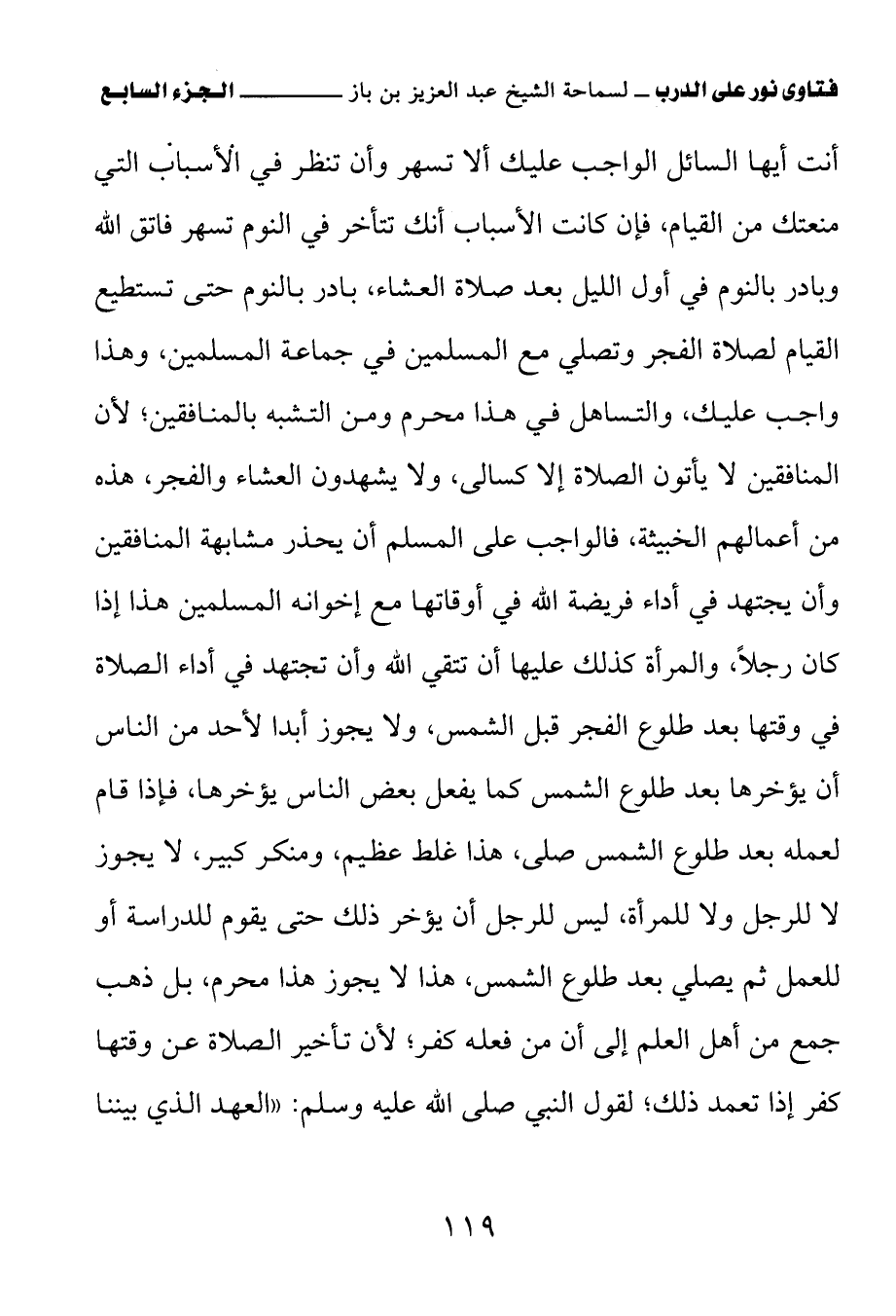 أنت أيها السائل الواجب عليك ألا تسهر، وأن تنظر في الأسباب التي منعتك من القيام، فإن كانت الأسباب أنك تتأخر في النوم تسهر فاتق الله، وبادر بالنوم في أول الليل بعد صلاة العشاء، بادر بالنوم حتى تستطيع القيام لصلاة الفجر، وتصلي مع المسلمين في جماعة المسلمين، وهذا واجب عليك، والتساهل في هذا محرم، ومن التشبه بالمنافقين؛ لأن المنافقين لا يأتون الصلاة إلا كسالى، ولا يشهدون العشاء والفجر، هذه من أعمالهم الخبيثة، فالواجب على المسلم أن يحذر مشابهة المنافقين، وأن يجتهد في أداء فريضة الله في أوقاتها مع إخوانه المسلمين، هذا إذا كان رجلا، والمرأة كذلك عليها أن تتقي الله، وأن تجتهد في أداء الصلاة في وقتها بعد طلوع الفجر قبل الشمس، ولا يجوز أبدا لأحد من الناس أن يؤخرها بعد طلوع الشمس، كما يفعل بعض الناس يؤخرها، فإذا قام لعمله بعد طلوع الشمس صلى، هذا غلط عظيم، ومنكر كبير، لا يجوز لا للرجل ولا للمرأة، ليس للرجل أن يؤخر ذلك حتى يقوم للدراسة، أو للعمل، ثم يصلي بعد طلوع الشمس، هذا لا يجوز هذا محرم؛ بل ذهب جمع من أهل العلم إلى أن من فعله كفر؛ لأن تأخير الصلاة عن وقتها كفر إذا تعمد ذلك؛ لقول النبي - صلى الله عليه وسلم -: «العهد الذي بيننا