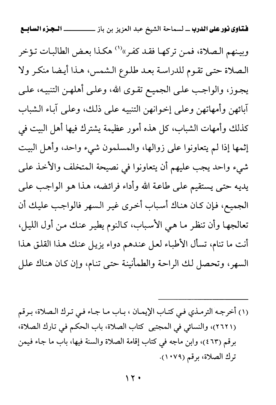 وبينهم الصلاة، فمن تركها فقد كفر (¬1)» هكذا بعض الطالبات تؤخر الصلاة حتى تقوم للدراسة بعد طلوع الشمس، هذا أيضا منكر ولا يجوز، والواجب على الجميع تقوى الله، وعلى أهلهن التنبيه، على آبائهن وأمهاتهن وعلى إخوانهن التنبيه على ذلك، وعلى آباء الشباب كذلك وأمهات الشباب، كل هذه أمور عظيمة يشترك فيه أهل البيت في إثمها إذا لم يتعاونوا على زوالها، والمسلمون شيء واحد، وأهل البيت شيء واحد، يجب عليهم أن يتعاونوا في نصيحة المتخلف، والأخذ على يديه حتى يستقيم على طاعة الله وأداء فرائضه، هذا هو الواجب على الجميع، فإن كان هناك أسباب أخرى غير السهر فالواجب عليك أن تعالجها، وأن تنظر ما هي الأسباب، كالنوم يطير عنك من أول الليل، أنت ما تنام، تسأل الأطباء لعل عندهم دواء يزيل عنك هذا القلق هذا السهر، وتحصل لك الراحة والطمأنينة حتى تنام، وإن كان هناك علل