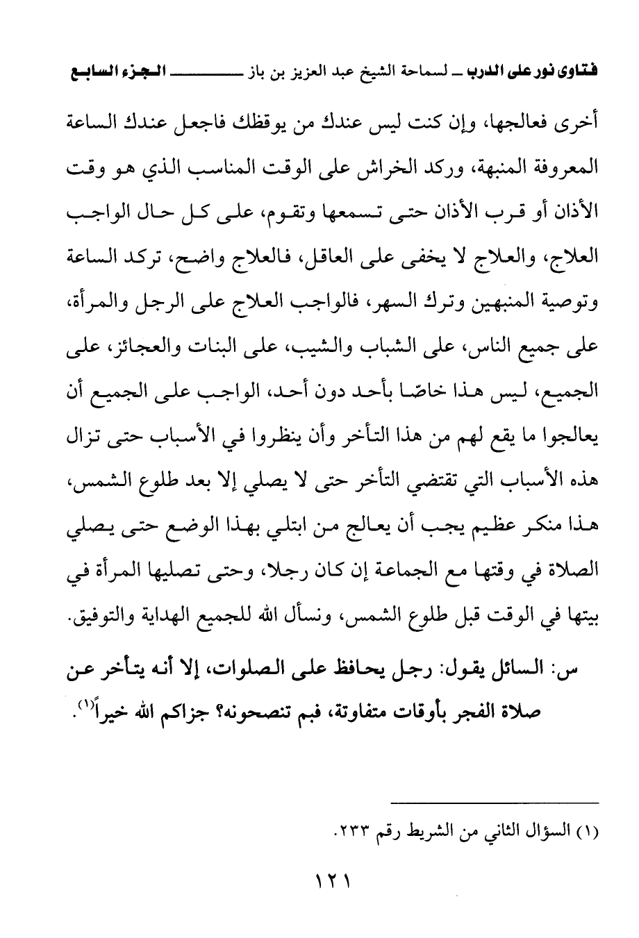 أخرى فعالجها، وإن كنت ليس عندك من يوقظك فاجعل عندك الساعة المعروفة المنبهة، وركد الخراش على الوقت المناسب الذي هو وقت الأذان، أو قرب الأذان حتى تسمعها وتقوم، على كل حال الواجب العلاج، والعلاج لا يخفى على العاقل، فالعلاج واضح، تركد الساعة، وتوصية المنبهين، وترك السهر، فالواجب العلاج على الرجل والمرأة، على جميع الناس، على الشباب والشيب، على البنات والعجائز، على الجميع، ليس هذا خاصا بأحد دون أحد.