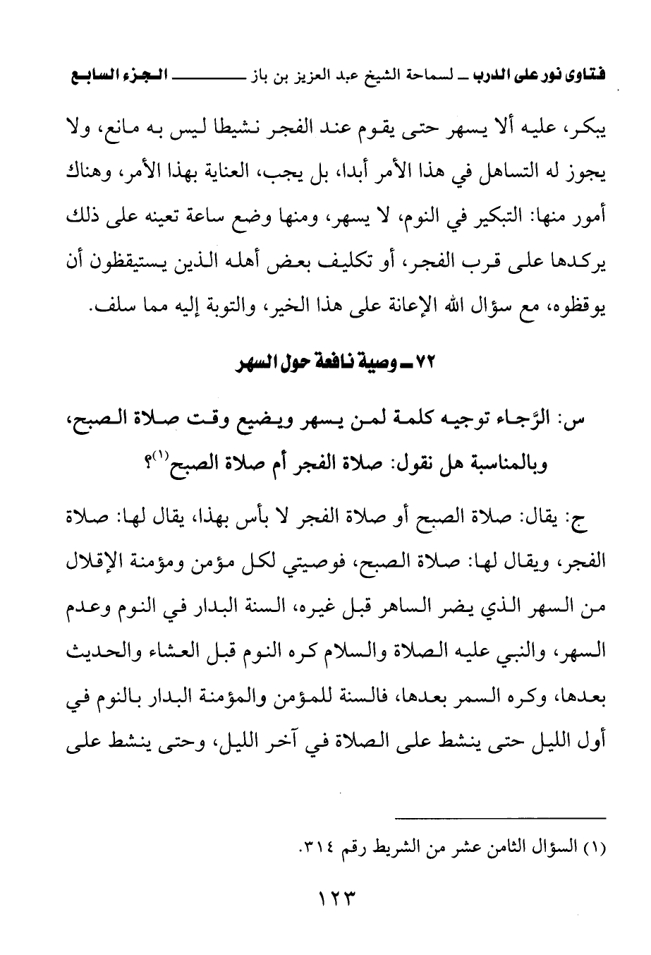 ج: يقال: صلاة الصبح أو صلاة الفجر لا بأس بهذا، يقال لها: صلاة الفجر، ويقال لها: صلاة الصبح، فوصيتي لكل مؤمن ومؤمنة الإقلال من السهر الذي يضر الساهر قبل غيره، السنة البدار في النوم وعدم السهر، والنبي – عليه الصلاة والسلام - كره النوم قبل العشاء والحديث بعدها، وكره السمر بعدها، فالسنة للمؤمن والمؤمنة البدار بالنوم في أول الليل حتى ينشط على الصلاة في آخر الليل، وحتى ينشط على