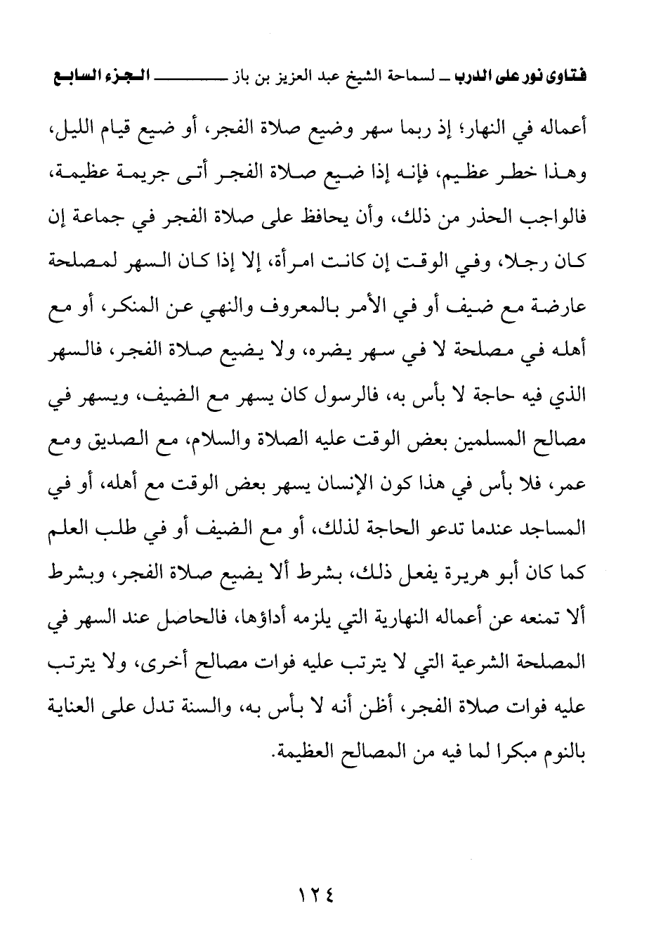 أعماله في النهار، إذ ربما سهر وضيع صلاة الفجر، أو ضيع قيام الليل، وهذا خطر عظيم، فإنه إذا ضيع صلاة الفجر أتى جريمة عظيمة، فالواجب الحذر من ذلك، وأن يحافظ على صلاة الفجر في جماعة إن كان رجلا، وفي الوقت إن كانت امرأة، إلا إذا كان السهر لمصلحة عارضة مع ضيف، أو في الأمر بالمعروف والنهي عن المنكر، أو مع أهله في مصلحة لا في سهر يضره، ولا يضيع صلاة الفجر، فالسهر الذي فيه حاجة لا بأس به، فالرسول كان يسهر مع الضيف، ويسهر في مصالح المسلمين بعض الوقت عليه الصلاة والسلام، مع الصديق ومع عمر، فلا بأس في هذا كون الإنسان يسهر بعض الوقت مع أهله، أو في المساجد عندما تدعو الحاجة لذلك، أو مع الضيف أو في طلب العلم، كما كان أبو هريرة يفعل ذلك، بشرط ألا يضيع صلاة الفجر، وبشرط ألا تمنعه عن أعماله النهارية التي يلزمه أداؤها.