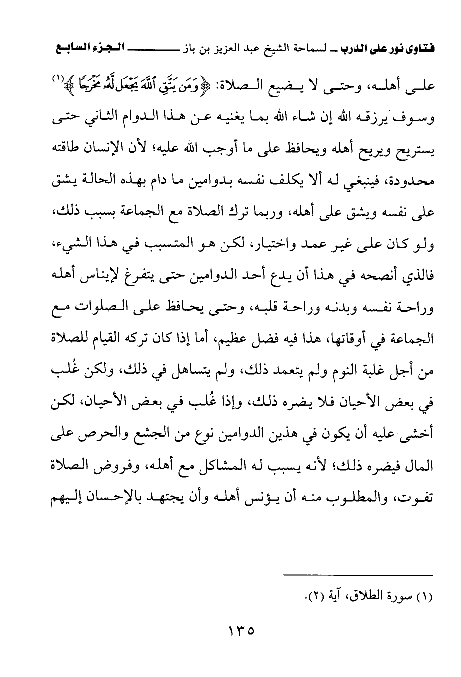 على أهله، وحتى لا يضيع الصلاة: {وَمَنْ يَتَّقِ اللَّهَ يَجْعَلْ لَهُ مَخْرَجًا} (¬1) وسوف يرزقه الله إن شاء الله بما يغنيه عن هذا الدوام الثاني حتى يستريح ويريح أهله، ويحافظ على ما أوجب الله عليه؛ لأن الإنسان طاقته محدودة، فينبغي له ألا يكلف نفسه بداومين ما دام بهذه الحالة يشق على نفسه ويشق على أهله، وربما ترك الصلاة مع الجماعة بسبب ذلك، ولو كان على غير عمد واختيار، لكن هو المتسبب في هذا الشيء.
