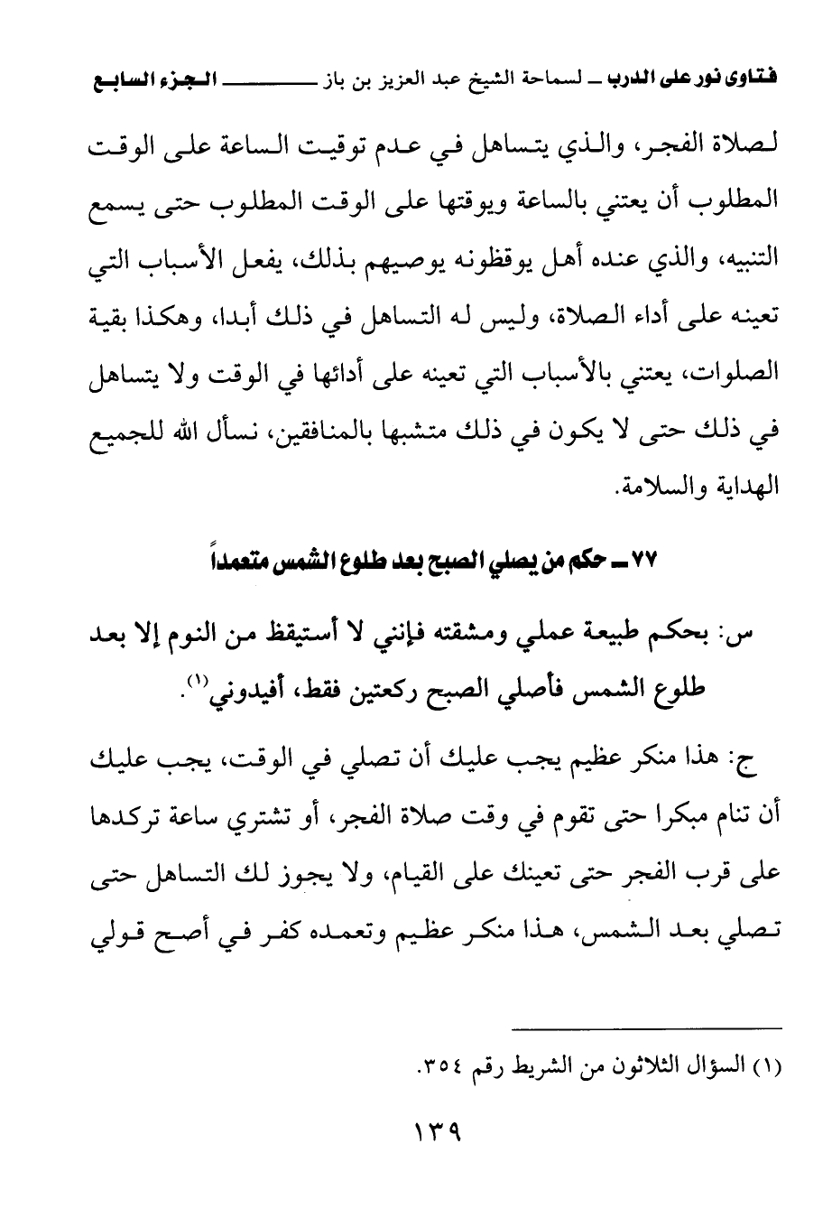 77 – حكم من يصلي الصبح بعد طلوع الشمس متعمدا