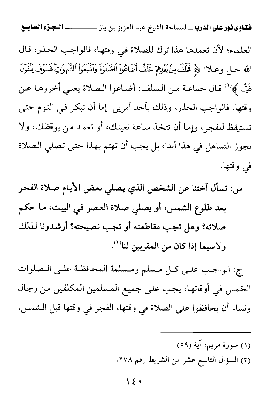 ج: الواجب على كل مسلم ومسلمة المحافظة على الصلوات الخمس في أوقاتها، يجب على جميع المسلمين المكلفين من رجال ونساء أن يحافظوا على الصلاة في وقتها، الفجر في وقتها قبل الشمس،