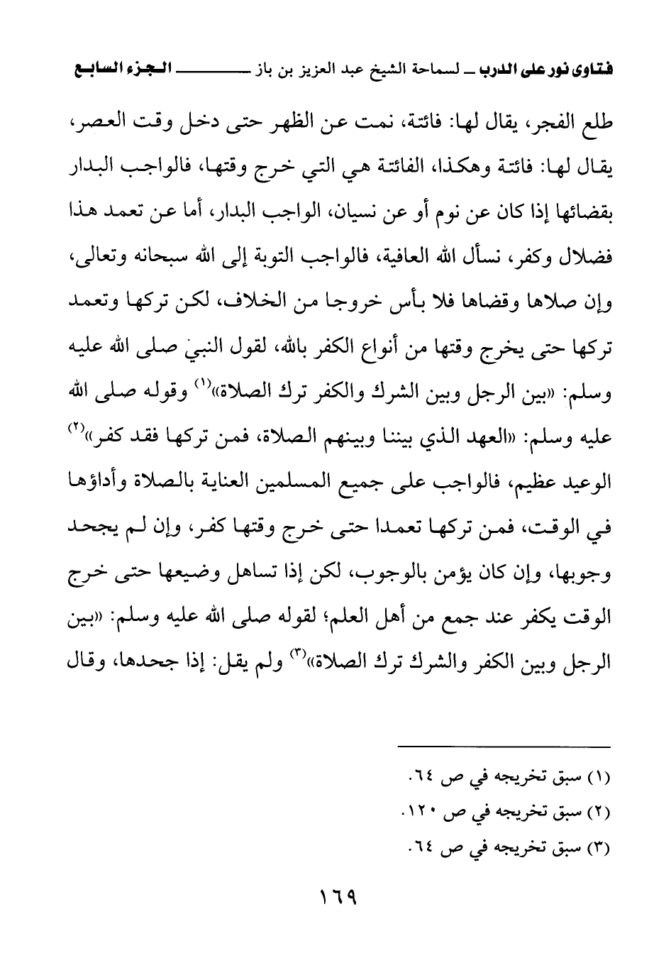 فالواجب على جميع المسلمين العناية بالصلاة وأداؤها في الوقت، فمن تركها تعمدا حتى خرج وقتها كفر، وإن لم يجحد وجوبها، وإن كان يؤمن بالوجوب، لكن إذا تساهل وضيعها حتى خرج الوقت يكفر عند جمع من أهل العلم؛ لقوله - صلى الله عليه وسلم -: «بين الرجل وبين الكفر والشرك ترك الصلاة (¬3)» ولم يقل: إذا جحدها، وقال