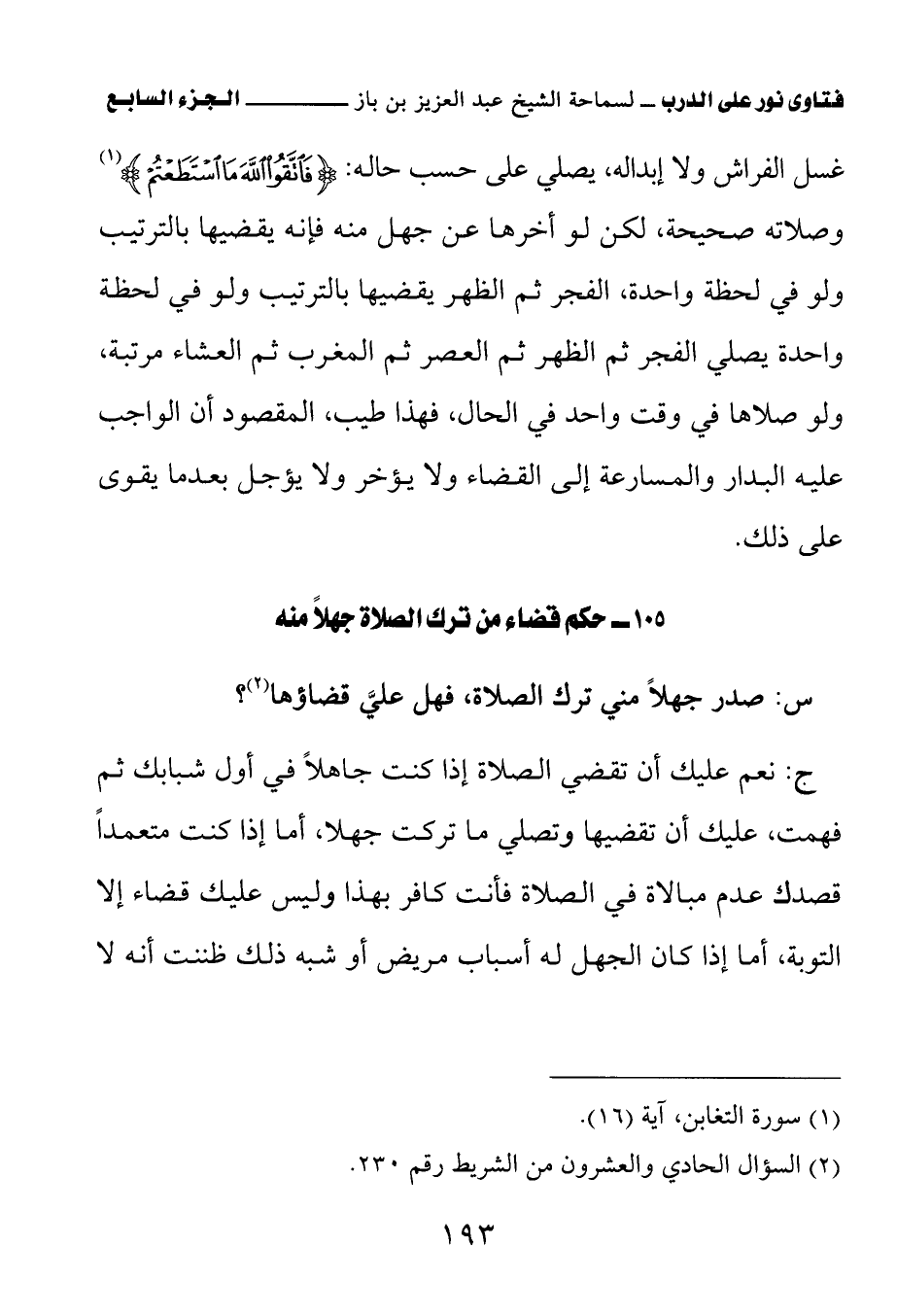 105 – حكم قضاء من ترك الصلاة جهلا منه