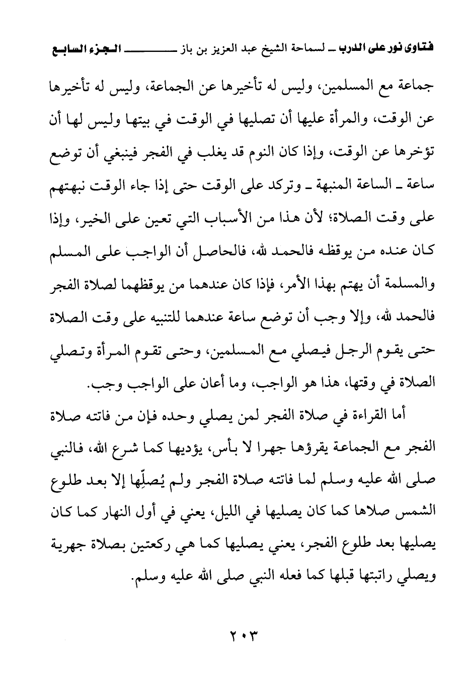 جماعة مع المسلمين، وليس له تأخيرها عن الجماعة، وليس له تأخيرها عن الوقت، والمرأة عليها أن تصليها في الوقت في بيتها وليس لها أن تؤخرها عن الوقت، وإذا كان النوم قد يغلب في الفجر فينبغي أن توضع ساعة - الساعة المنبهة - وتركد على الوقت حتى إذا جاء الوقت نبهتهم على وقت الصلاة؛ لأن هذا من الأسباب التي تعين على الخير، وإذا كان عنده من يوقظه فالحمد لله، فالحاصل أن الواجب على المسلم والمسلمة أن يهتم بهذا الأمر، فإذا كان عندهما من يوقظهما لصلاة الفجر فالحمد لله، وإلا وجب أن توضع ساعة عندهما للتنبيه على وقت الصلاة حتى يقوم الرجل فيصلي مع المسلمين، وحتى تقوم المرأة وتصلي الصلاة في وقتها، هذا هو الواجب، وما أعان على الواجب وجب.