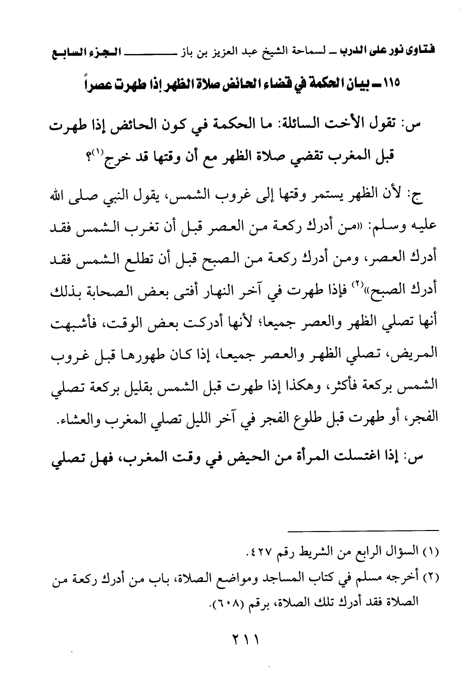 ج: لأن الظهر يستمر وقتها إلى غروب الشمس، يقول النبي صلى الله عليه وسلم: «من أدرك ركعة من العصر قبل أن تغرب الشمس فقد أدرك العصر، ومن أدرك ركعة من الصبح قبل أن تطلع الشمس فقد أدرك الصبح (¬2)» فإذا طهرت في آخر النهار أفتى بعض الصحابة بذلك أنها تصلي الظهر والعصر جميعا؛ لأنها أدركت بعض الوقت، فأشبهت المريض، تصلي الظهر والعصر جميعا، إذا كان طهورها قبل غروب الشمس بركعة فأكثر، وهكذا إذا طهرت قبل الشمس بقليل بركعة تصلي الفجر، أو طهرت قبل طلوع الفجر في آخر الليل تصلي المغرب والعشاء.