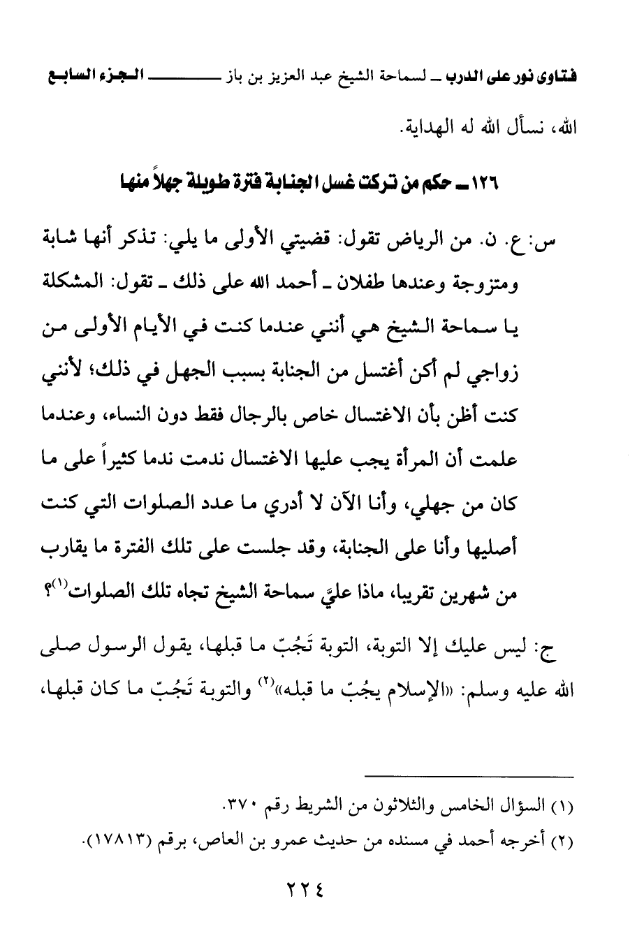 126 - حكم من تركت غسل الجنابة فترة طويلة جهلا منها
