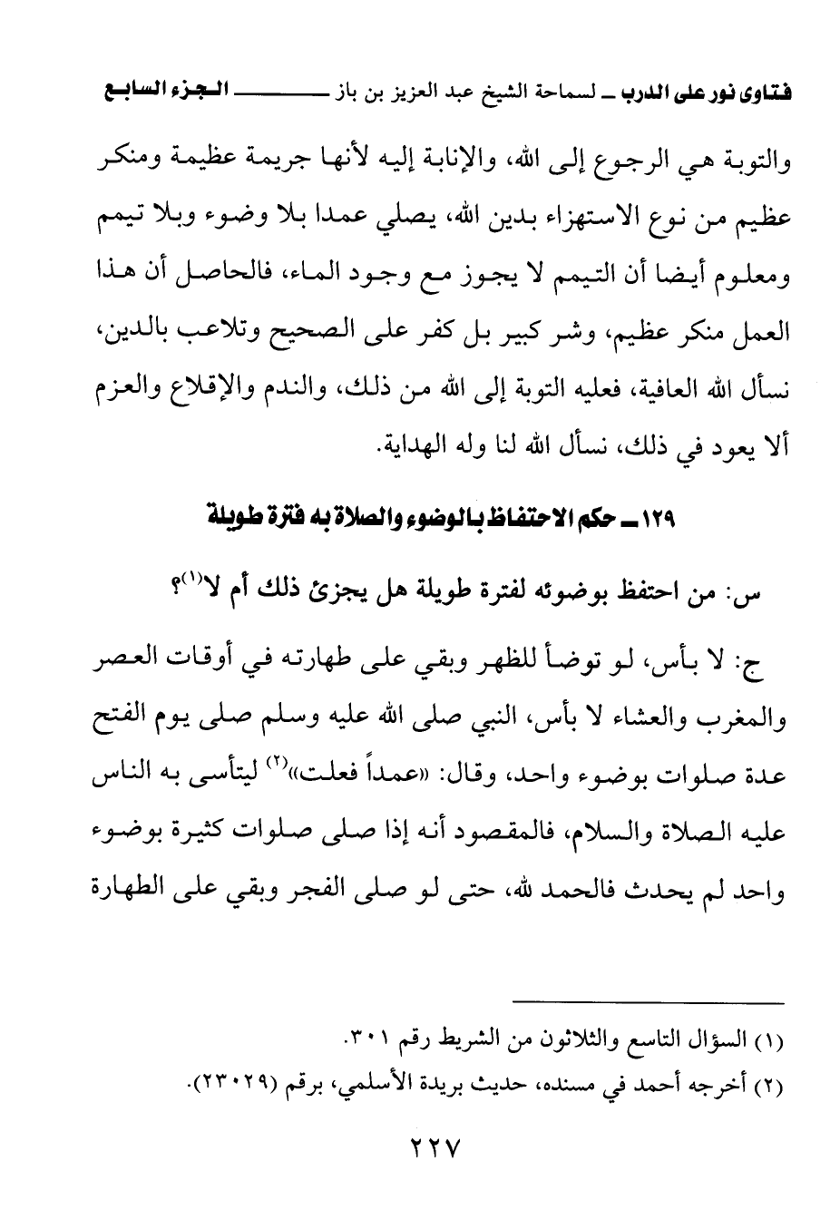 129 - حكم الاحتفاظ بالوضوء والصلاة به فترة طويلة