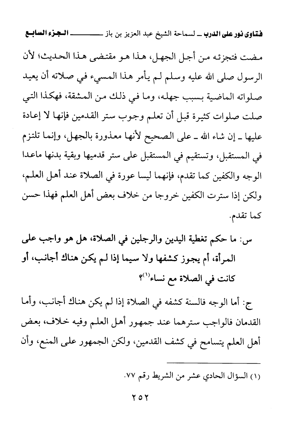 س: ما حكم تغطية اليدين والرجلين في الصلاة، هل هو واجب على المرأة، أم يجوز كشفها ولا سيما إذا لم يكن هناك أجانب، أو كانت في الصلاة مع نساء السؤال الحادي عشر من الشريط رقم 77.؟