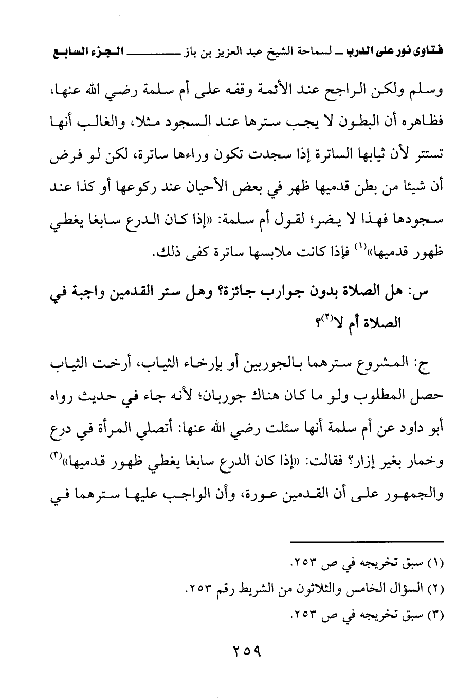 ج: المشروع سترهما بالجوربين أو بإرخاء الثياب، أرخت الثياب حصل المطلوب ولو ما كان هناك جوربان؛ لأنه جاء في حديث رواه أبو داود عن أم سلمة أنها سئلت رضي الله عنها: «أتصلي المرأة في درع وخمار بغير إزار؟ فقالت: إذا كان الدرع سابغا يغطي ظهور قدميها (¬3)» والجمهور على أن القدمين عورة، وأن الواجب عليها سترهما في