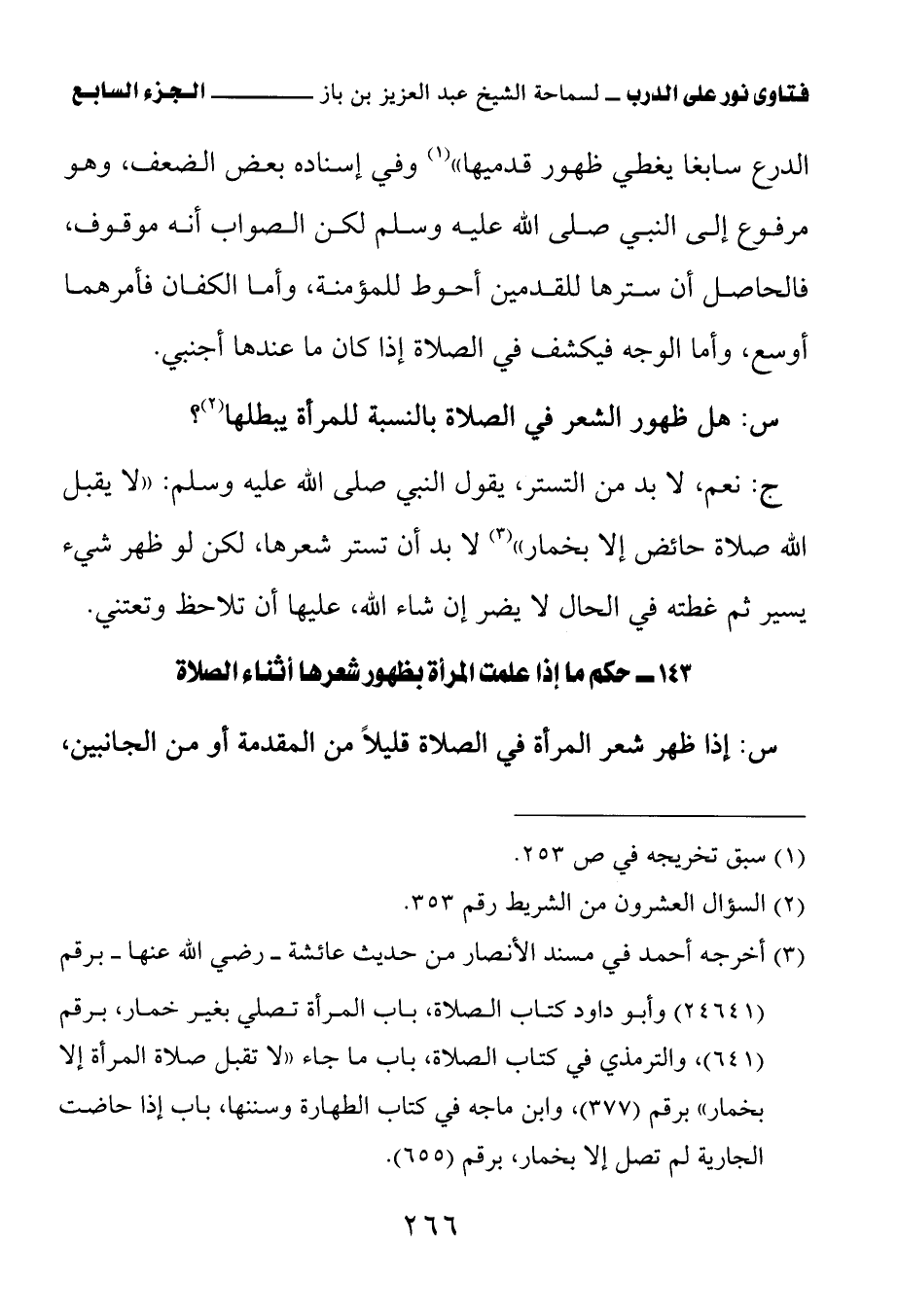 (¬3) أخرجه أحمد في مسند الأنصار من حديث عائشة - رضي الله عنها - برقم (24641)، والترمذي في كتاب الصلاة، باب ما جاء " لا تقبل صلاة المرأة إلا بخمار " رقم (377)، وابن ماجه في كتاب الطهارة وسننها، باب إذا حاضت الجارية لم تصل إلا بخمار، برقم (655).