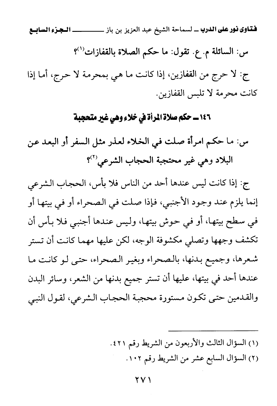 146 - حكم صلاة المرأة في خلاء وهي غير محجبة
