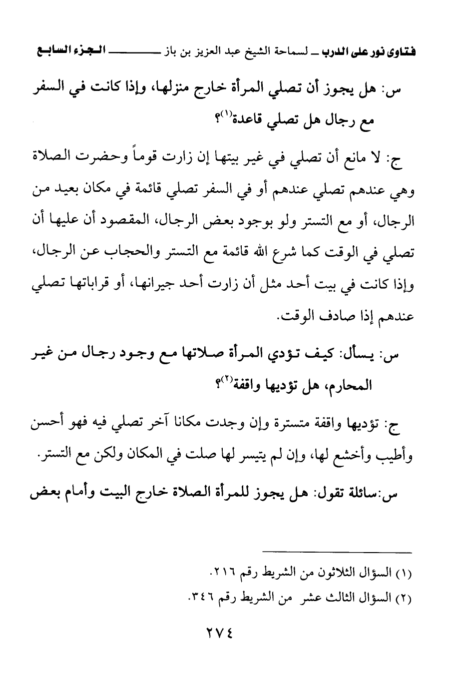 س: سائلة تقول: هل يجوز للمرأة الصلاة خارج البيت وأمام بعض