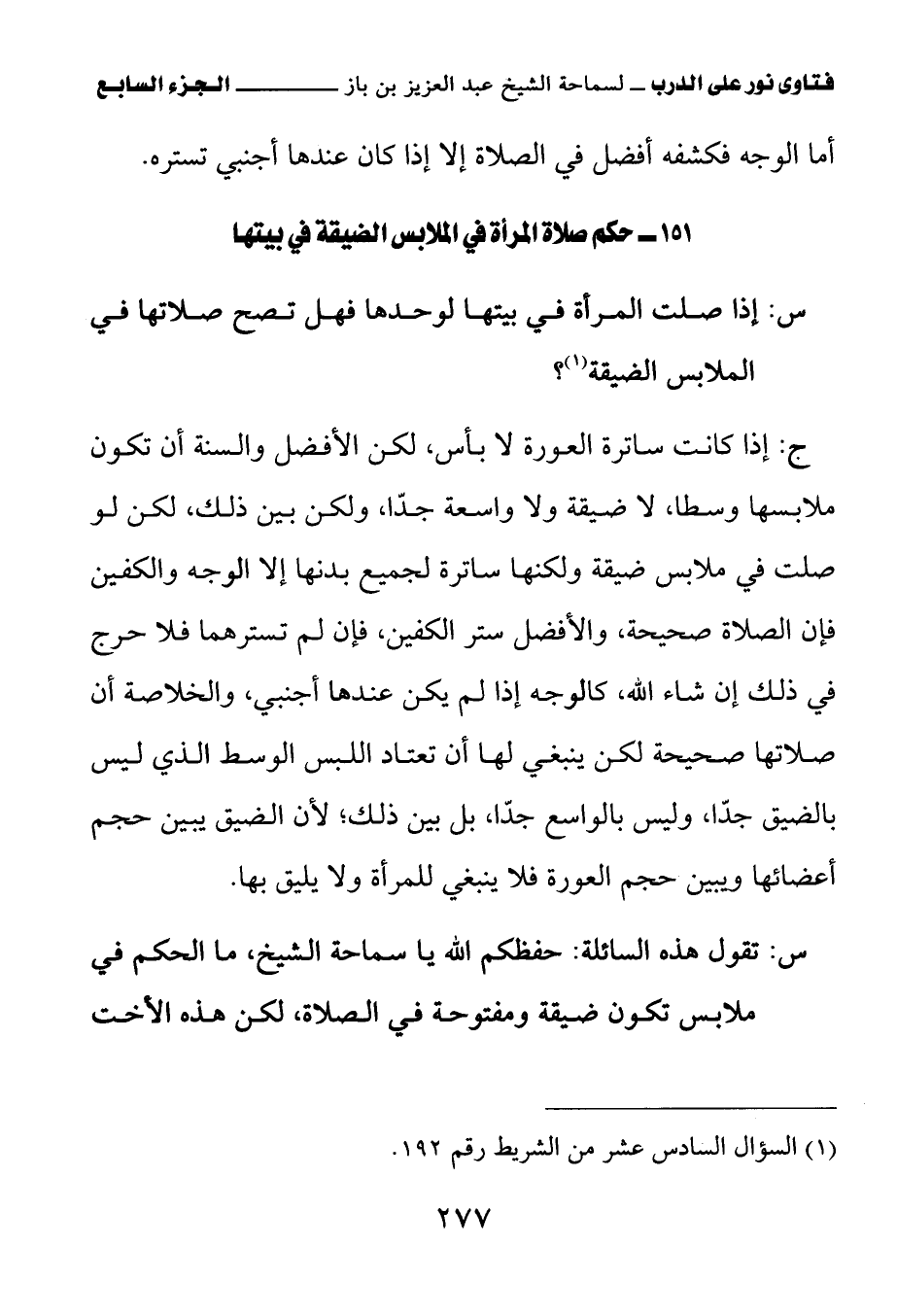 151 - حكم صلاة المرأة في الملابس الضيقة في بيتها