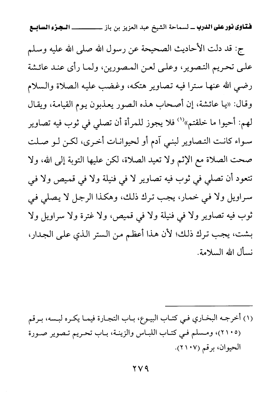 ج: قد دلت الأحاديث الصحيحة عن رسول الله صلى الله عليه وسلم على تحريم التصوير، وعلى لعن المصورين، ولما رأى عند عائشة رضي الله عنها سترا فيه تصاوير هتكه، وغضب عليه الصلاة والسلام وقال: «يا عائشة، إن أصحاب هذه الصور يعذبون يوم القيامة، ويقال لهم: أحيوا ما خلقتم (¬1)» فلا يجوز للمرأة أن تصلي في ثوب فيه تصاوير سواء كانت التصاوير لبني آدم أو لحيوانات أخرى، لكن لو صلت صحت الصلاة مع الإثم ولا تعيد الصلاة، لكن عليها التوبة إلى الله، ولا تتعود أن تصلي في ثوب فيه تصاوير لا في فنيلة ولا في قميص ولا في سراويل ولا في خمار، يجب ترك ذلك، وهكذا الرجل لا يصلي في ثوب فيه تصاوير ولا في فنيلة ولا في قميص، ولا غترة ولا سراويل ولا بشت، يجب ترك ذلك، لأن هذا أعظم من الستر الذي على الجدار، نسأل الله السلامة.