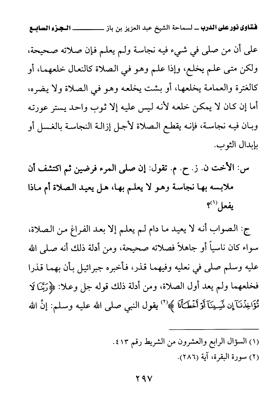 ج: الصواب أنه لا يعيد ما دام لم يعلم إلا بعد الفراغ من الصلاة، سواء كان ناسيا أو جاهلا فصلاته صحيحة، ومن أدلة ذلك أنه صلى الله عليه وسلم صلى في نعليه وفيهما قذر، فأخبره جبرائيل بأن بهما قذرا فخلعهما ولم يعد أول الصلاة، ومن أدلة ذلك قوله جل وعلا: {رَبَّنَا لَا تُؤَاخِذْنَا إِنْ نَسِينَا أَوْ أَخْطَأْنَا} (¬2) يقول النبي صلى الله عليه وسلم: «إن الله